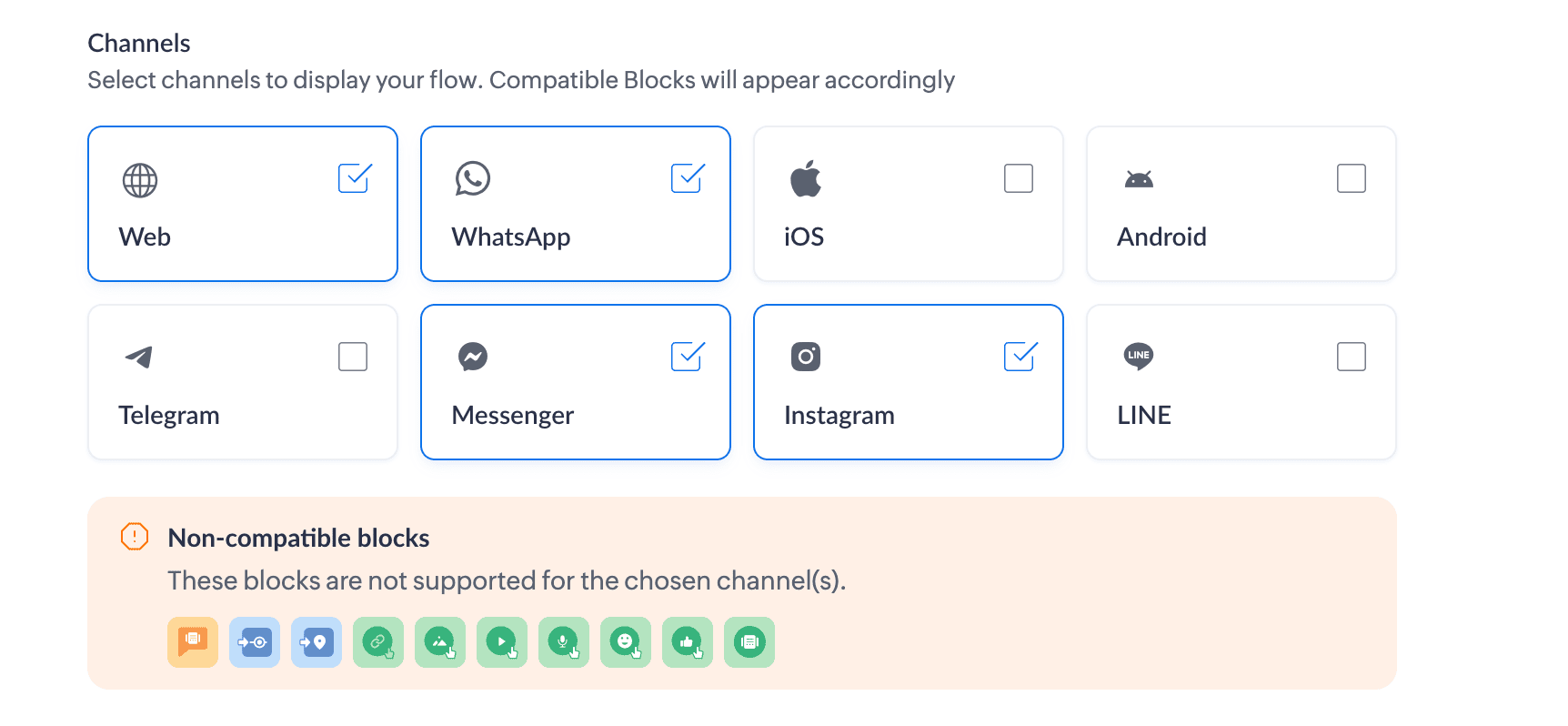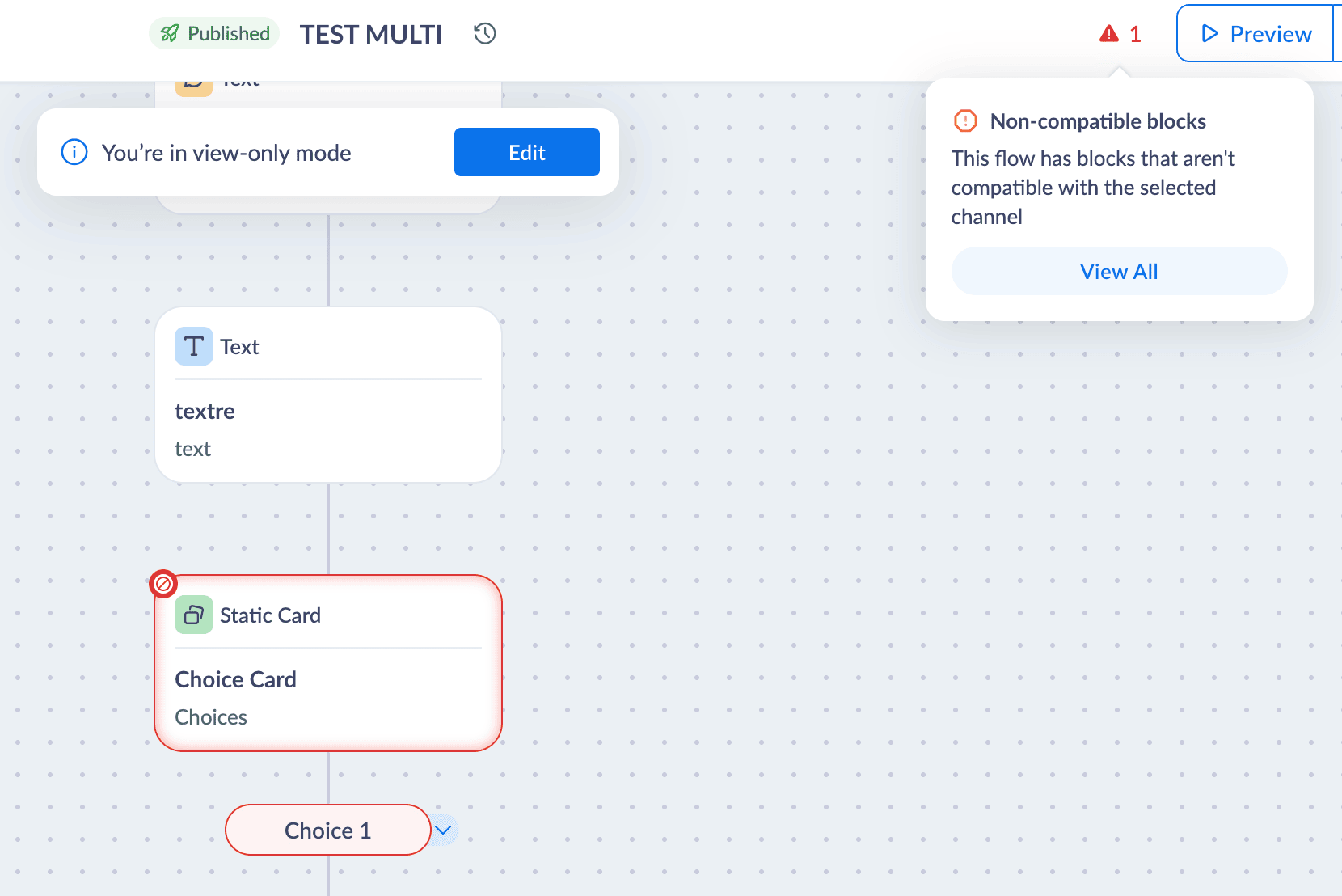 以下の画像は、特定の経路に対応していないブロックが使用されている場合に、フローの編集画面に表示されるエラーメッセージの例です。
