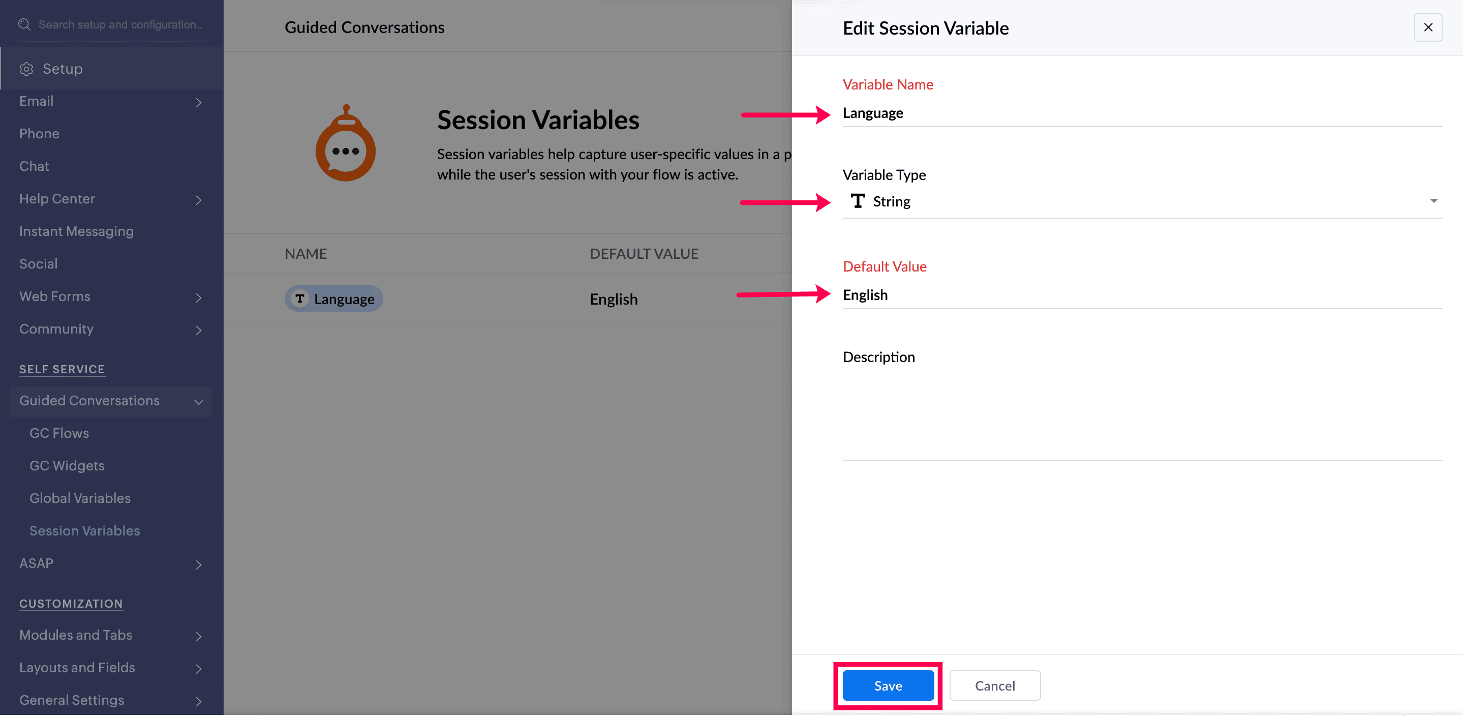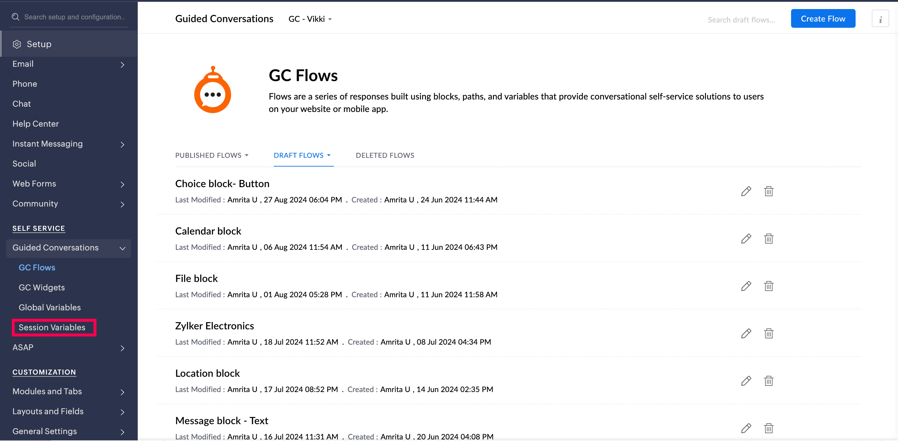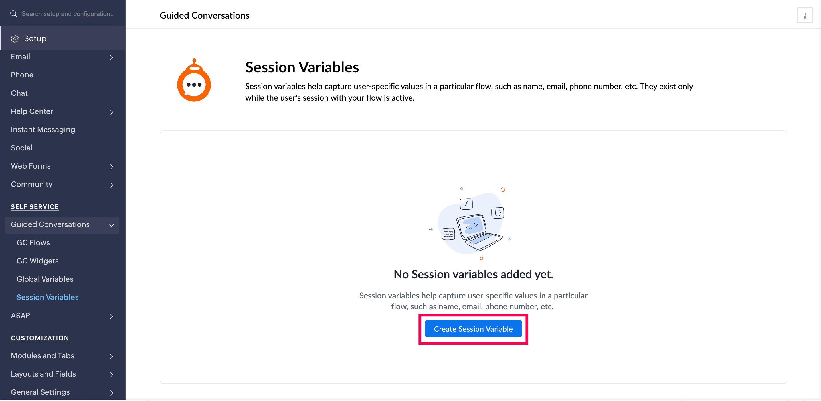 セッション変数とは、組織の自動ガイドボットでのセッション中に取得した顧客情報を保存するための変数です。組織のすべてのフローで使用できます。