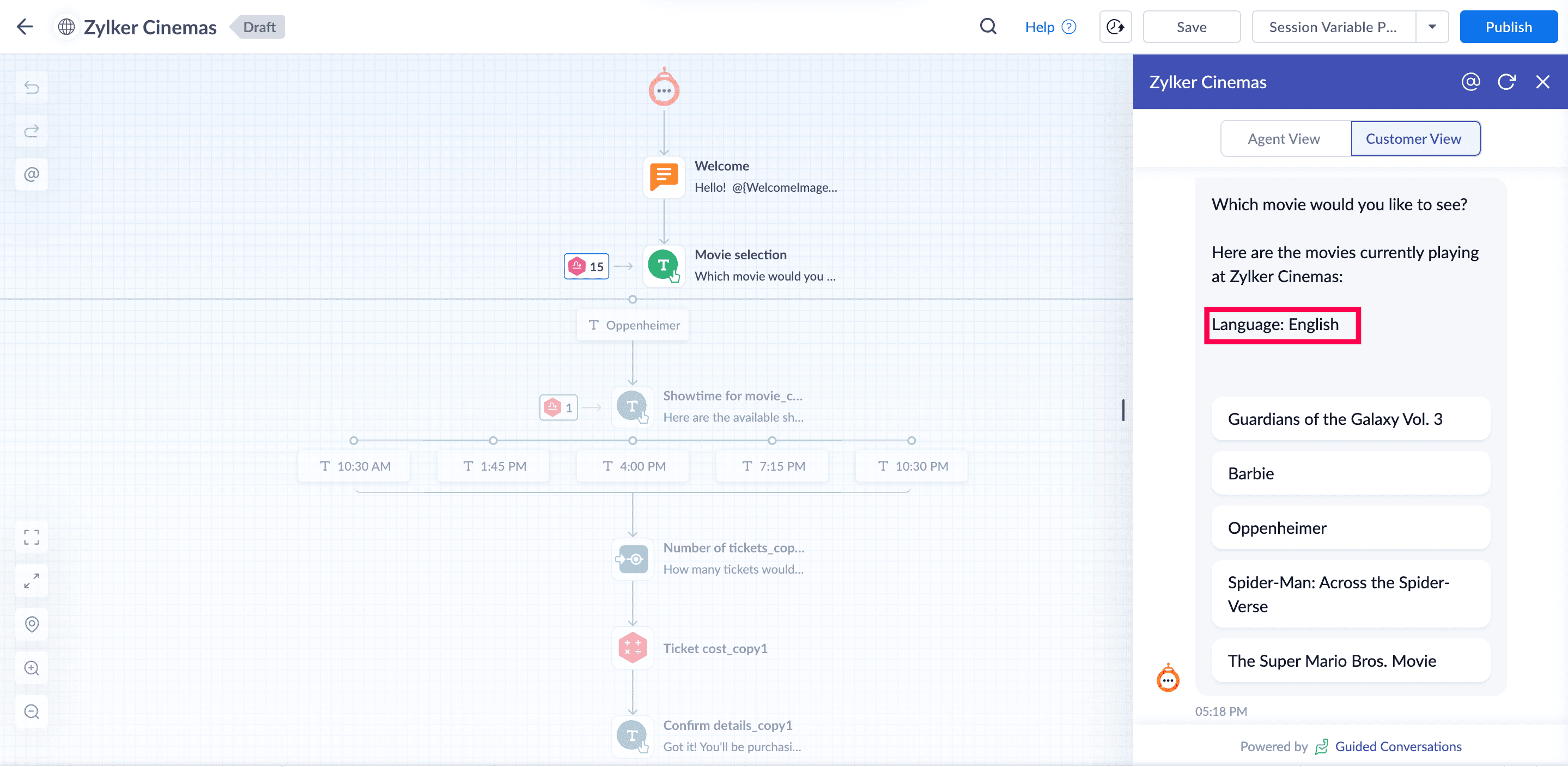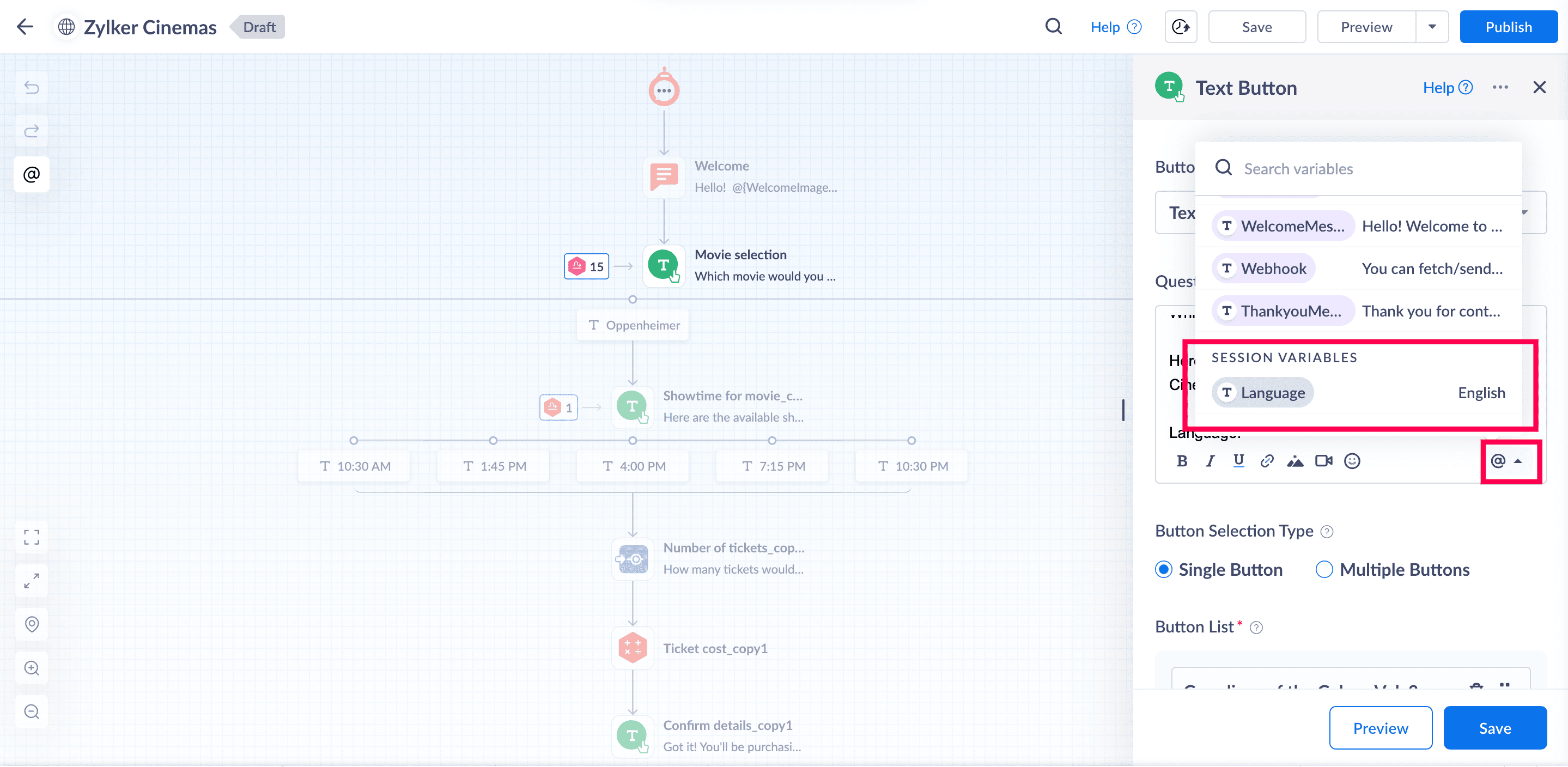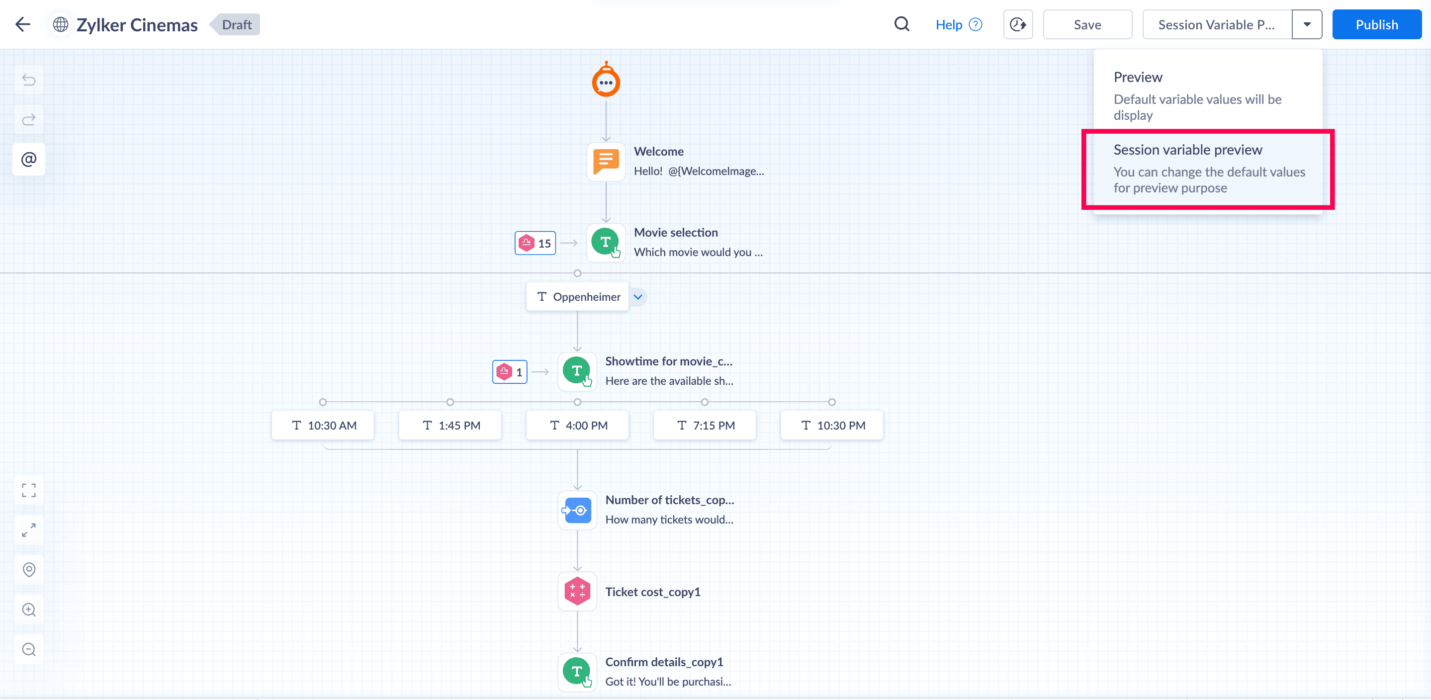 フロー内にセッション変数を使用した場合、プレビューを表示してセッション変数が実際の自動ガイドボットでどのように表示されるかを確認できます。プレビューの表示中にセッション変数の値を編集することも可能です。