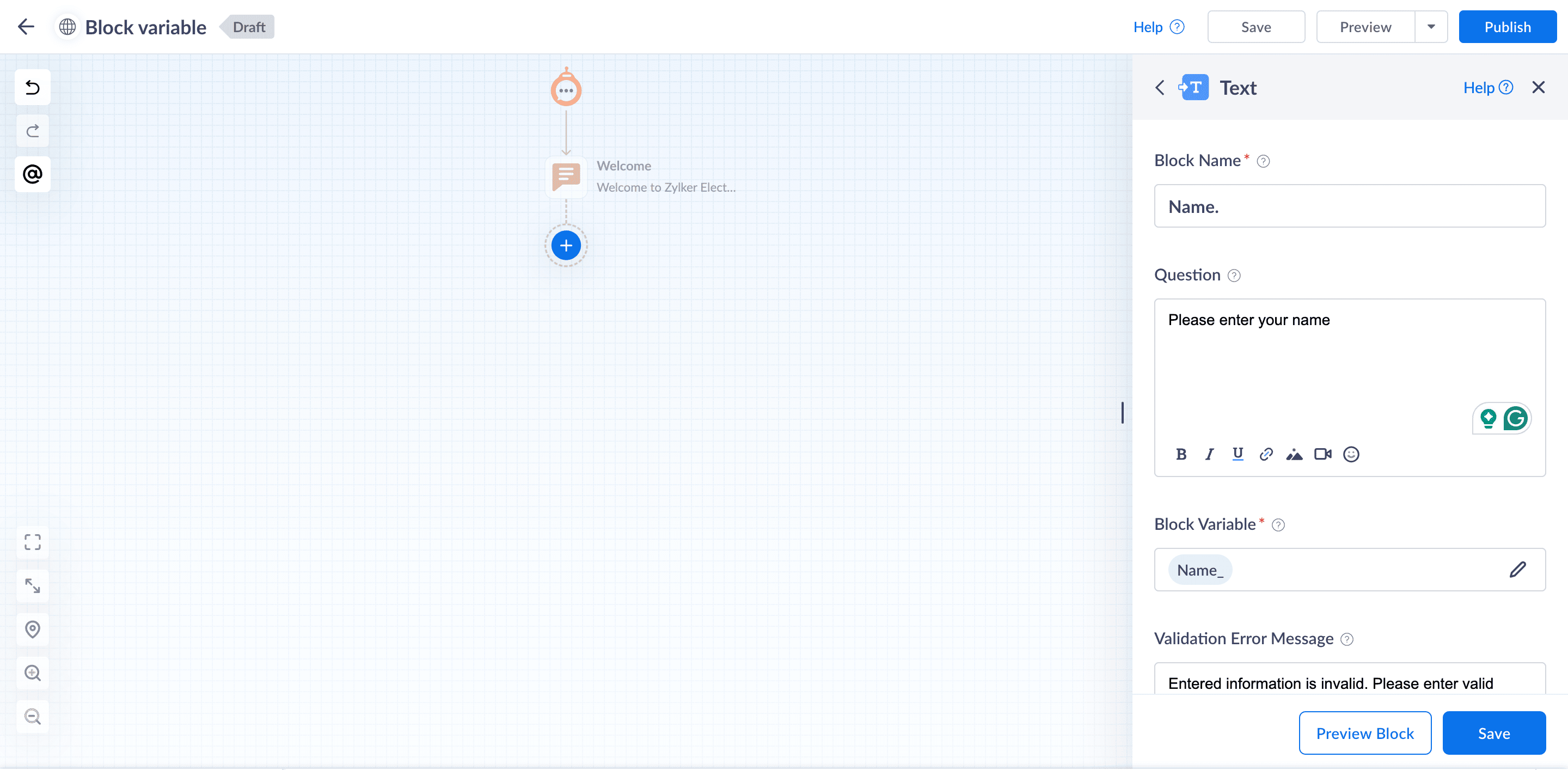 ブロック変数とは、質問ブロックと選択肢ブロックで利用者から受け取った値を保存するための変数です。以降のフローのやりとりにおいて、利用者に入力/選択してもらった情報を表示することができます。チャットでのやりとりを円滑に行うのに役立ちます。