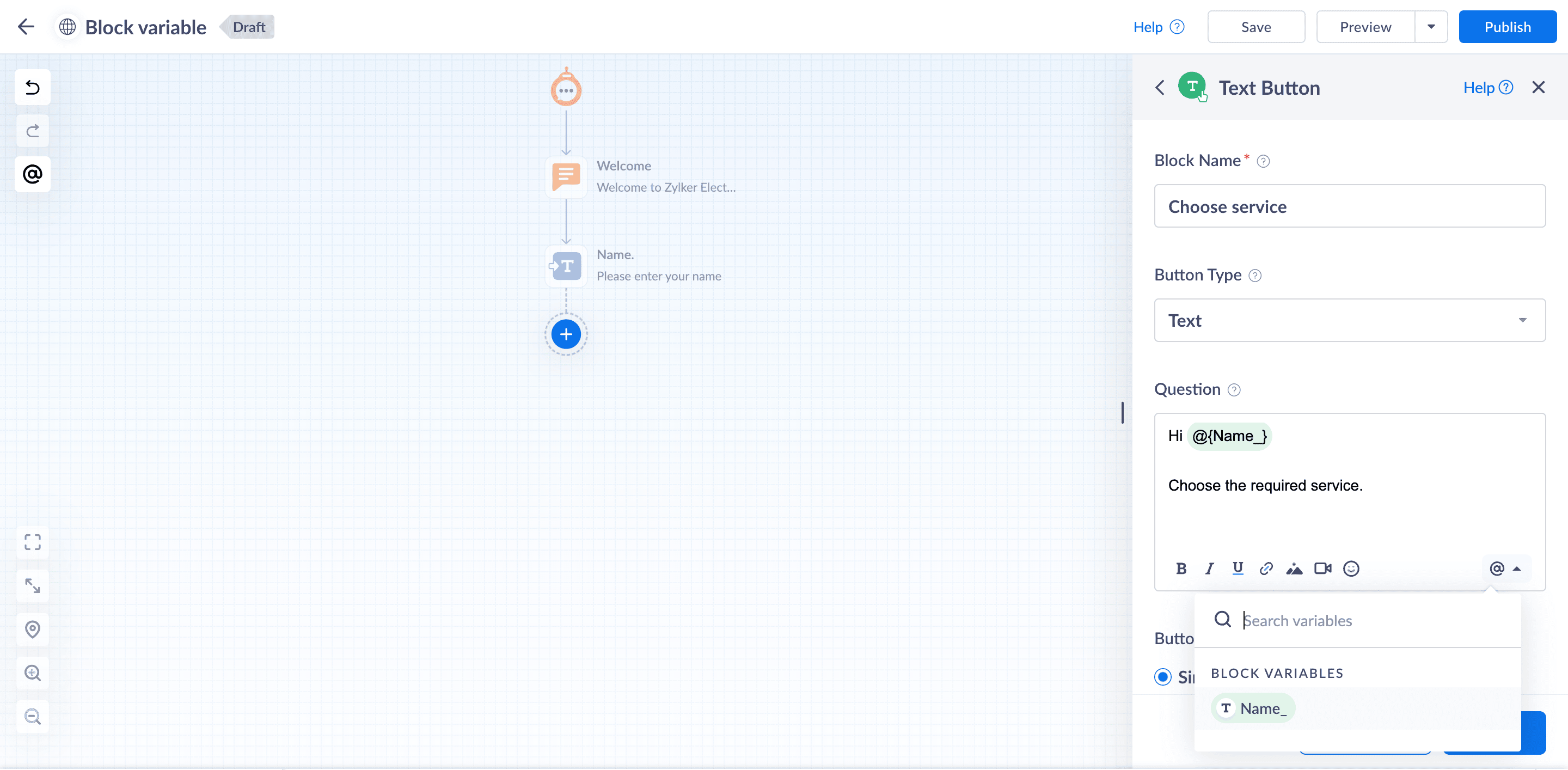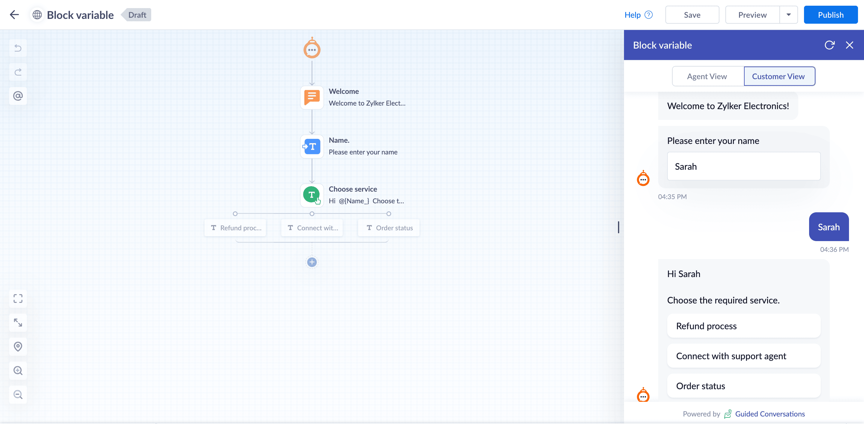 たとえば、質問ブロックで入力された名前をブロック変数として保存し、以降のやりとり中に利用者の名前を表示することが可能です。
