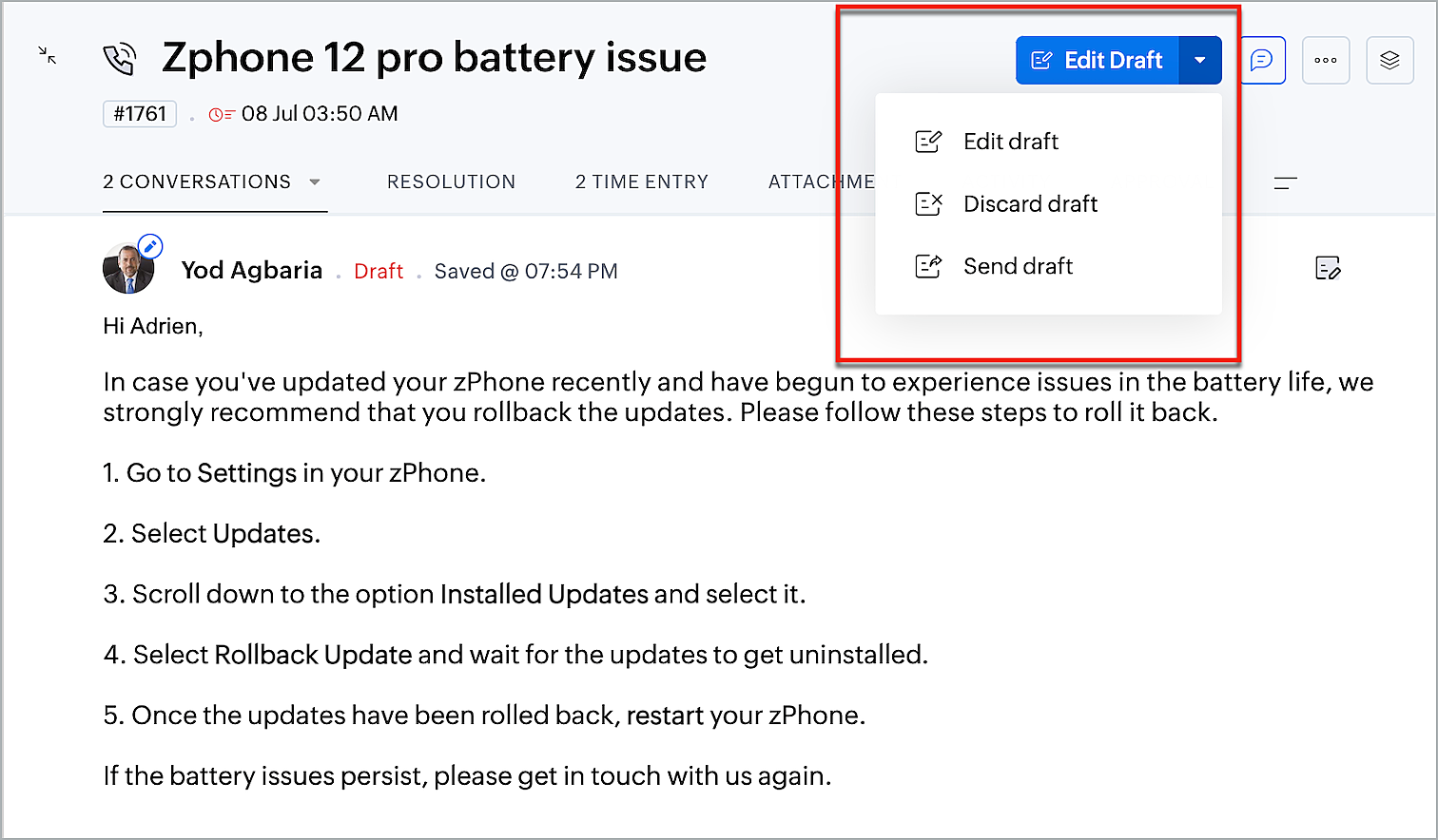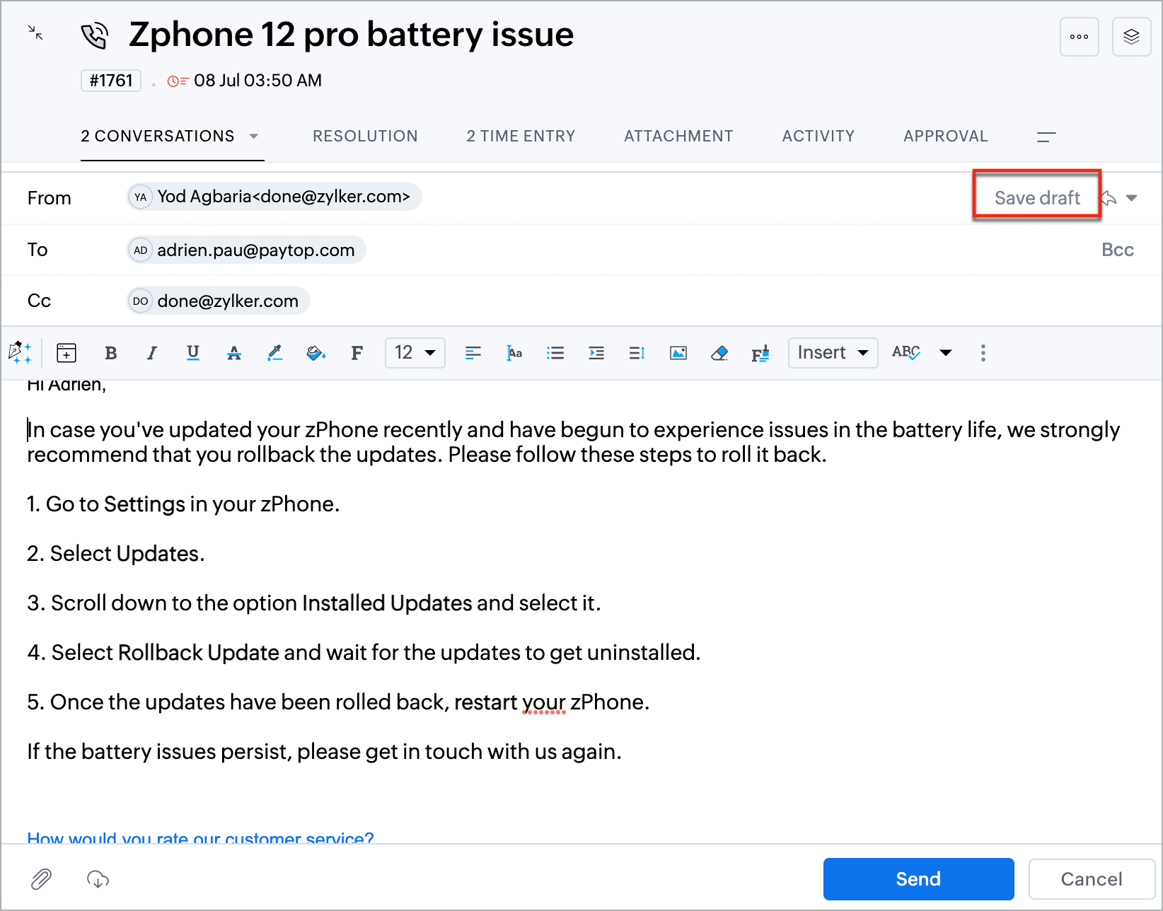 Zoho Deskでは、問い合わせへの返信を下書きとして保存できます。なお、問い合わせの返信画面では、編集内容が2分ごとに自動で下書きとして保存されます。これにより、作成途中の返信や、作成を完了した返信のデータの消失を防止できます。また、下書きは、自分の都合のよいタイミングに手動で保存することも可能です。