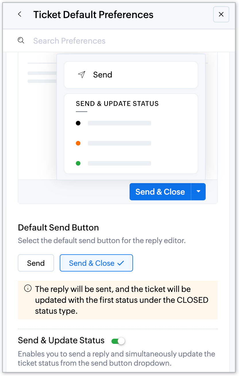 メモ:送信メニュー内の歯車アイコン(設定を開く)をクリックすることで、担当者は問い合わせの初期設定を確認できます(問い合わせの初期設定の画面には、プロフィールアイコン→[各種設定]→[問い合わせの初期設定]の順に移動することによってもアクセスできます)。こちらで、[送信してステータスを更新する]機能を無効にし、送信メニューから非表示にすることも可能です。なお、初期設定では有効になっています。