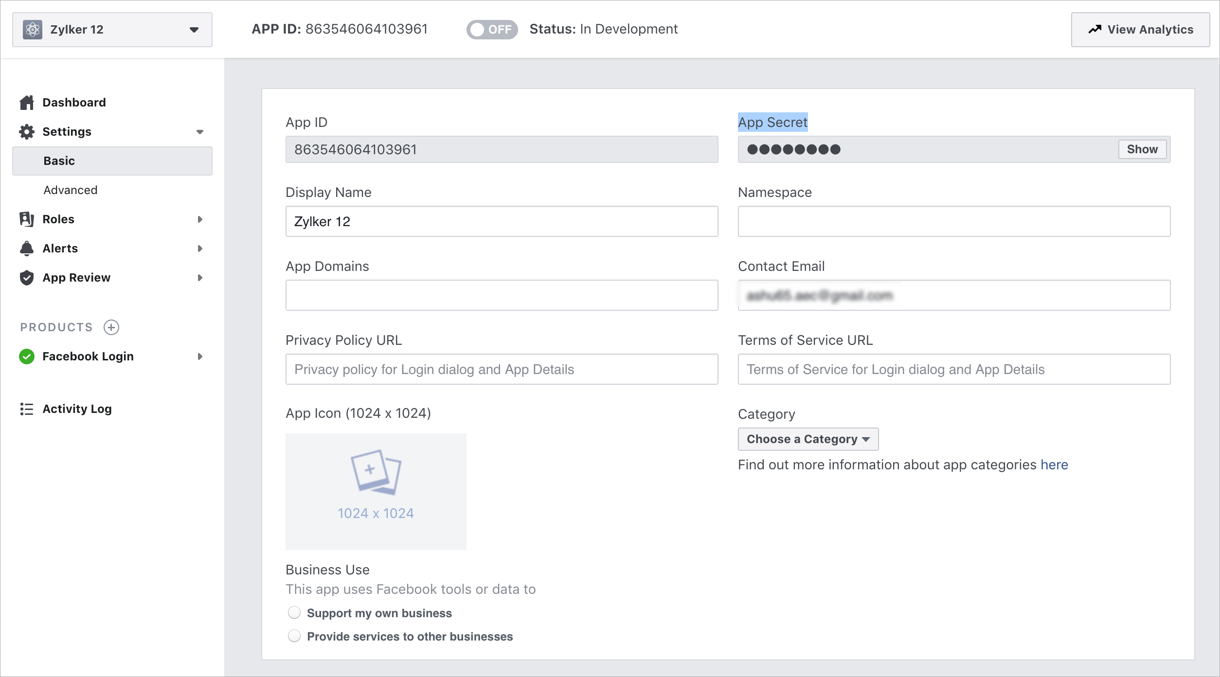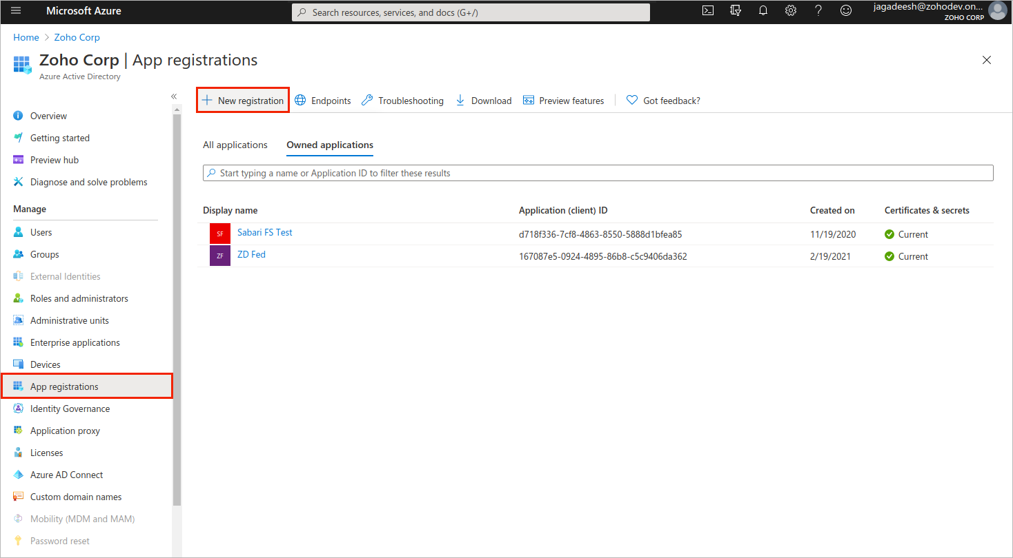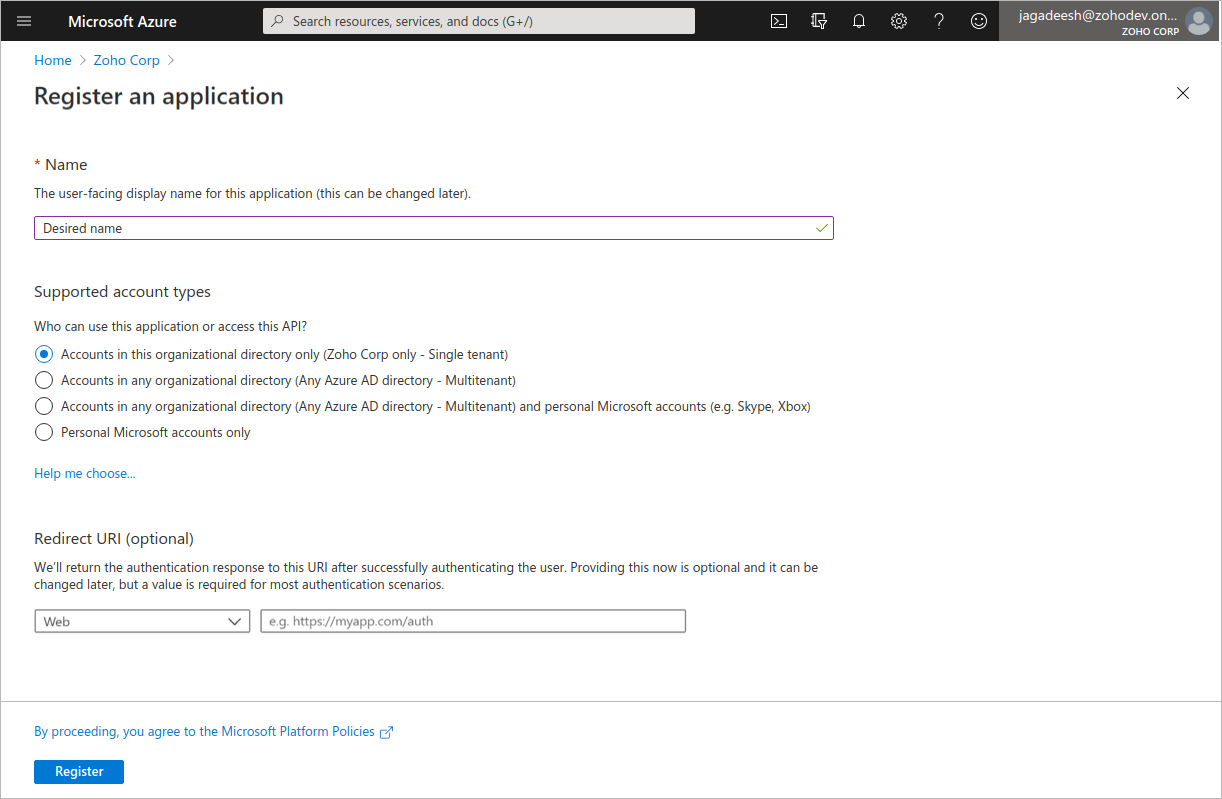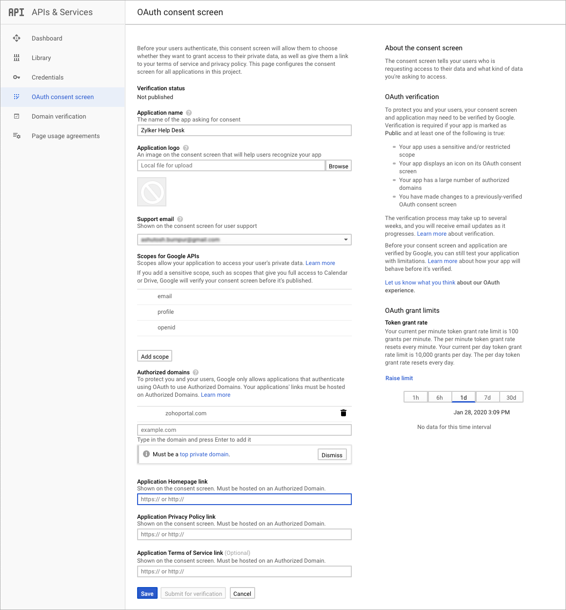- [承認済みドメイン]の欄に、Zoho Deskの連携サインインの設定画面からコピーした値を入力します。また、その他の必須項目を入力します。