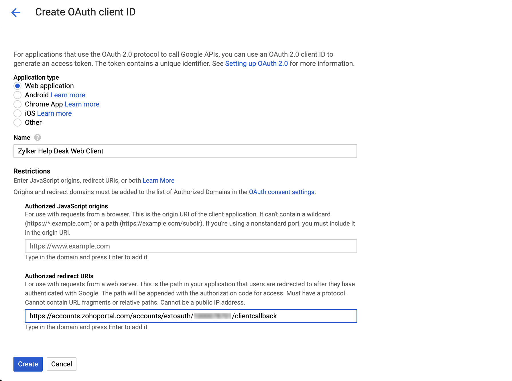 - [承認済みのリダイレクト URI]に、Zoho Deskの連携サインインの設定画面からコピーしたリダイレクトURI