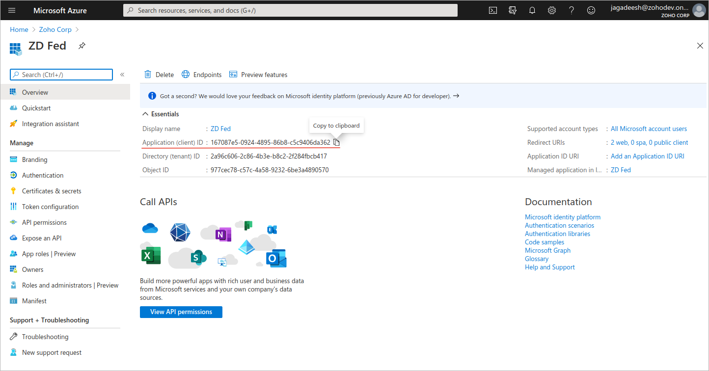 クライアントIDとクライアントシークレットの値をコピーします。コピーした値は、Zoho Deskの連携サインインの設定画面に貼り付けます。