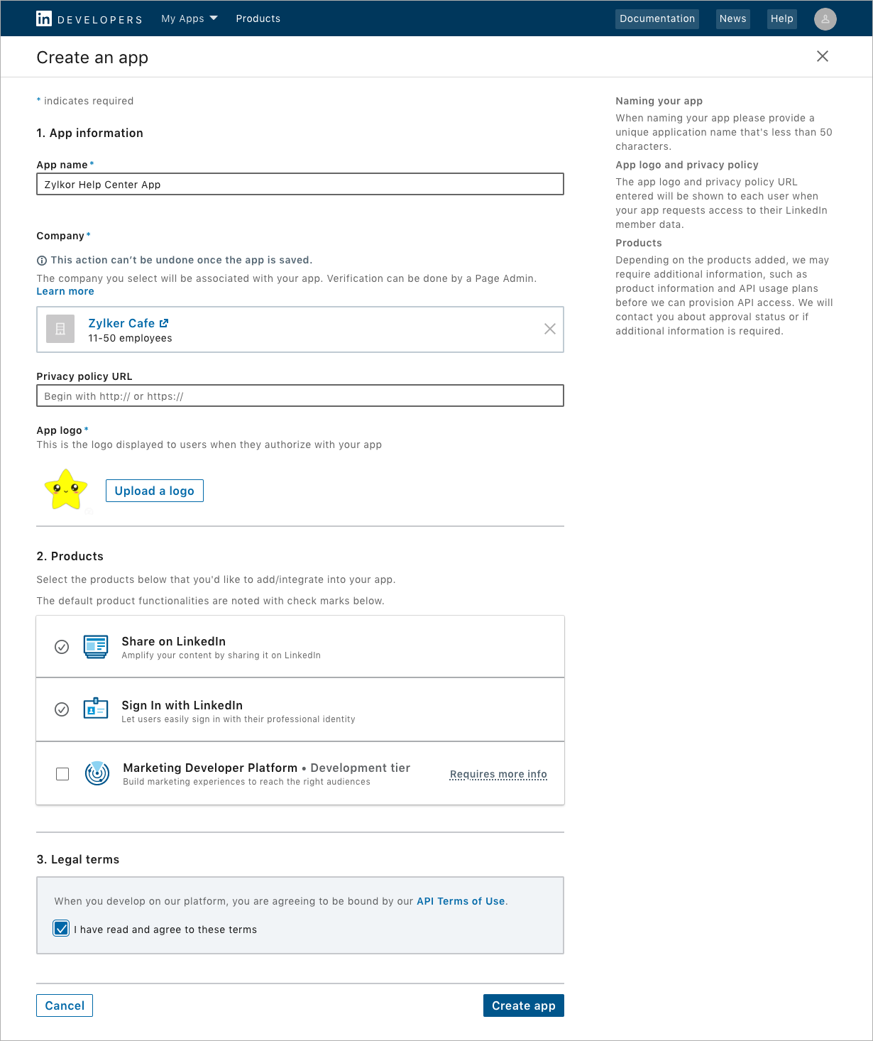 - アプリの作成画面で必要な設定を行い、[Create app](アプリを作成する)をクリックします。