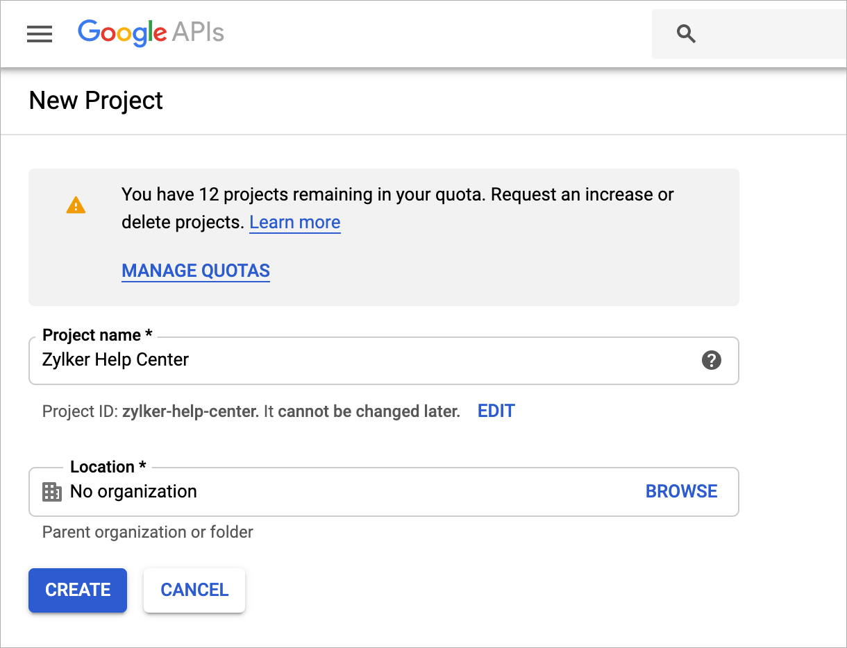 - [APIとサービス]のダッシュボードで、[プロジェクトを作成]をクリックし、プロジェクトの作成画面を開きます。