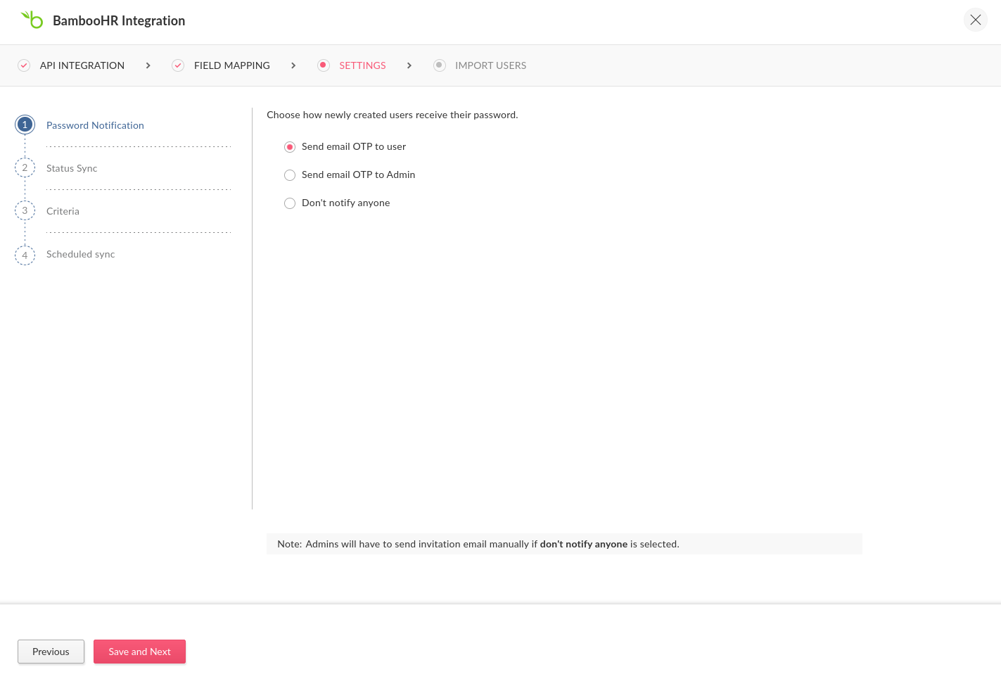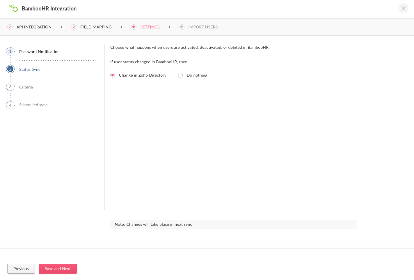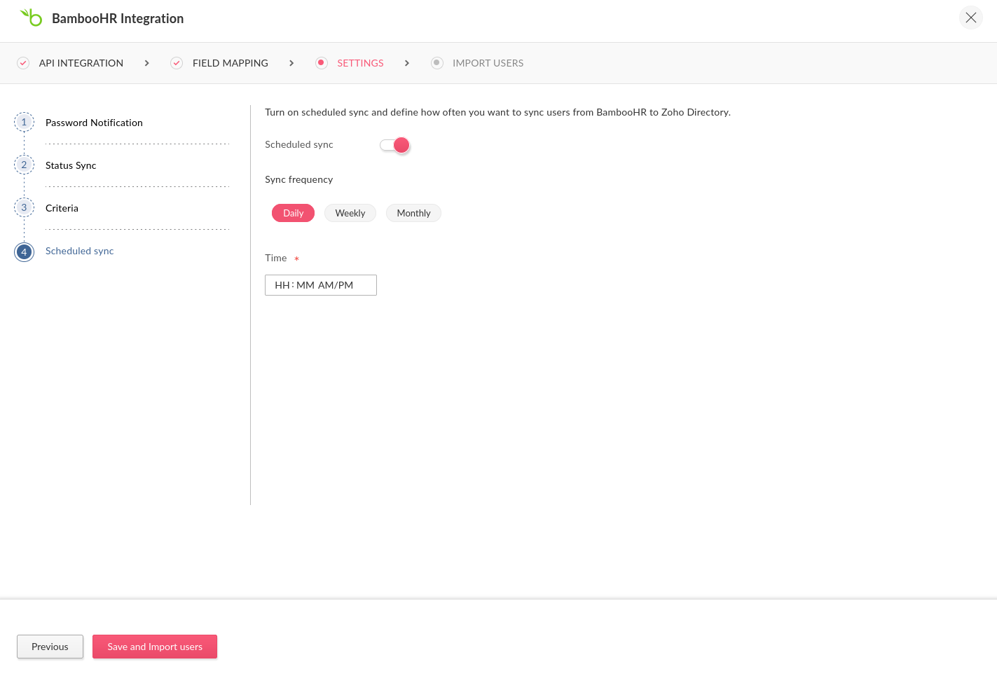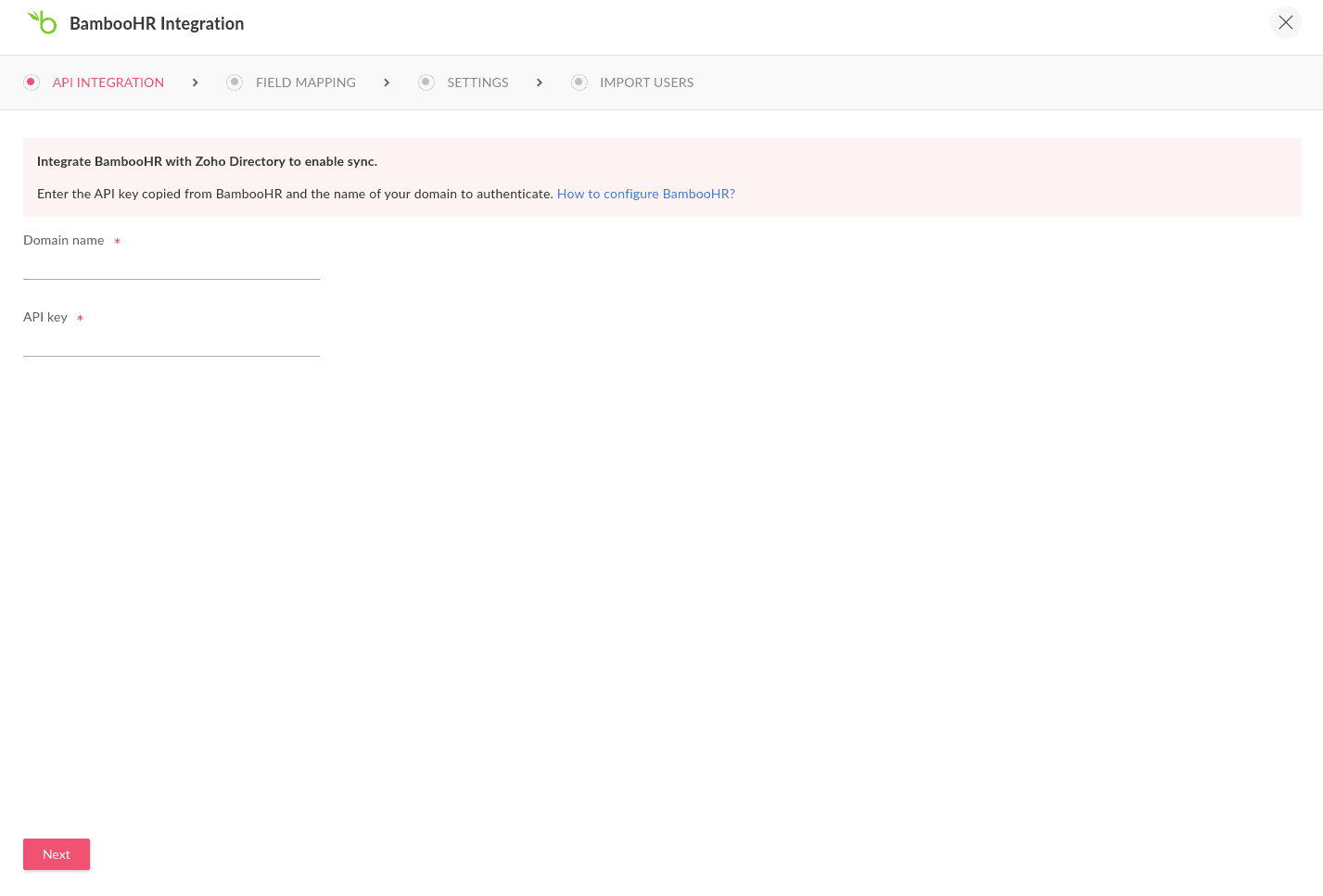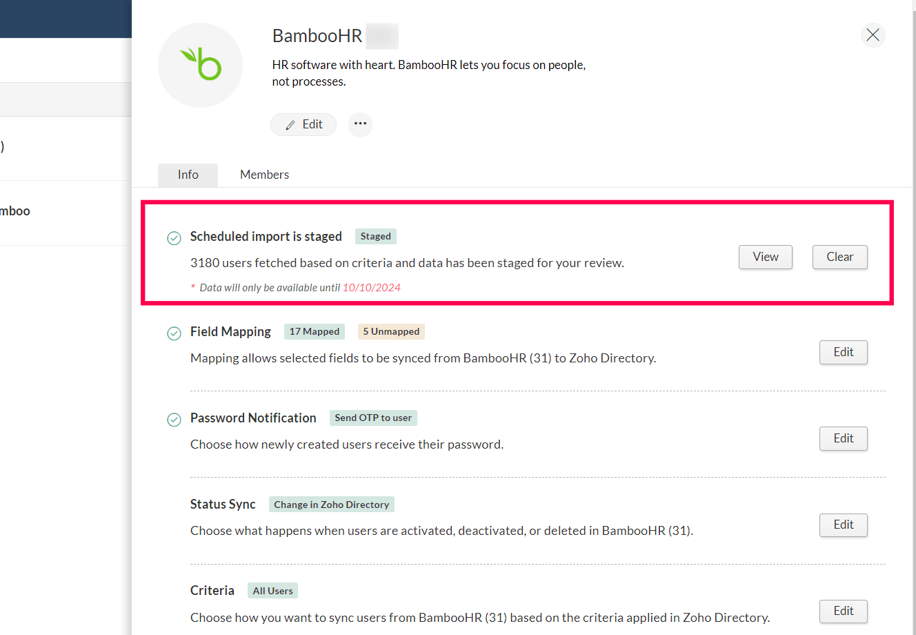 インポートする ユーザー: BambooHR では、Zoho Directory へのユーザーの一括インポートが可能になりました。すべてのユーザー(削除済みユーザーを除く)が取得され、選択した条件に応じて表示されます。200名を超えるユーザーを選択した場合、ユーザーは段階的に処理され、リストへの表示に時間がかかることがあります。処理が完了したら、表示または再インポートのためにクリアできます。