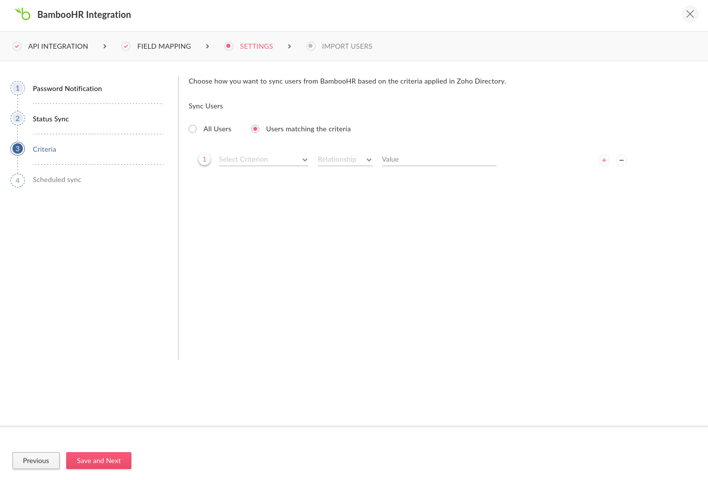BambooHRからユーザーをどのように同期するかを選択します。すべてのユーザーを同期することも、一部のユーザーのみをZoho Directory内の条件に基づいて同期することも可能です。カスタム属性を使って条件を設定できます。必要に応じて複数の条件を設定することもできます。