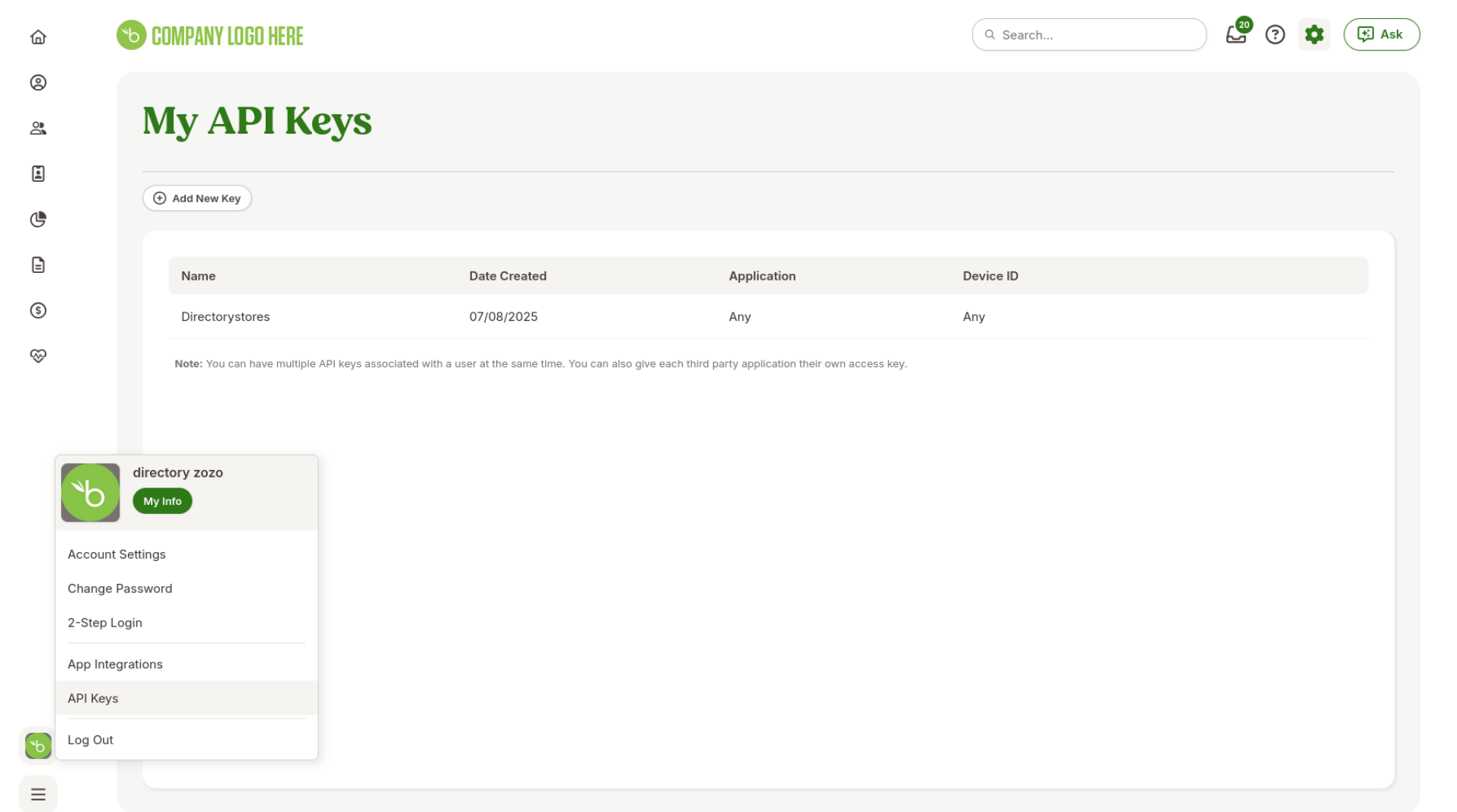 BambooHR で作成した APIキー は一度しか使用できません。新しく作成する場合は、新しく追加する キー をクリックします。