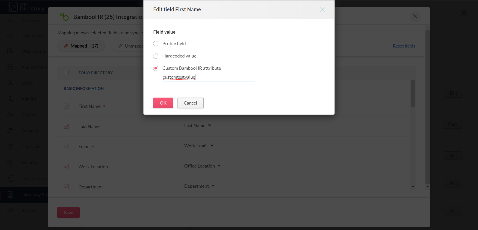 Zoho Directoryの項目 利用可能 をBambooHRの項目 利用可能 にマッピングします。BambooHRから同期されるすべてのユーザーに同じ値を設定したい場合は、その項目にハードコーディングされた値をマッピングしてください。たとえば、「Work 場所」項目の値を「India」にしたい場合は、Indiaをハードコーディング値として入力できます。ハードコーディング値を項目にマッピングするには: