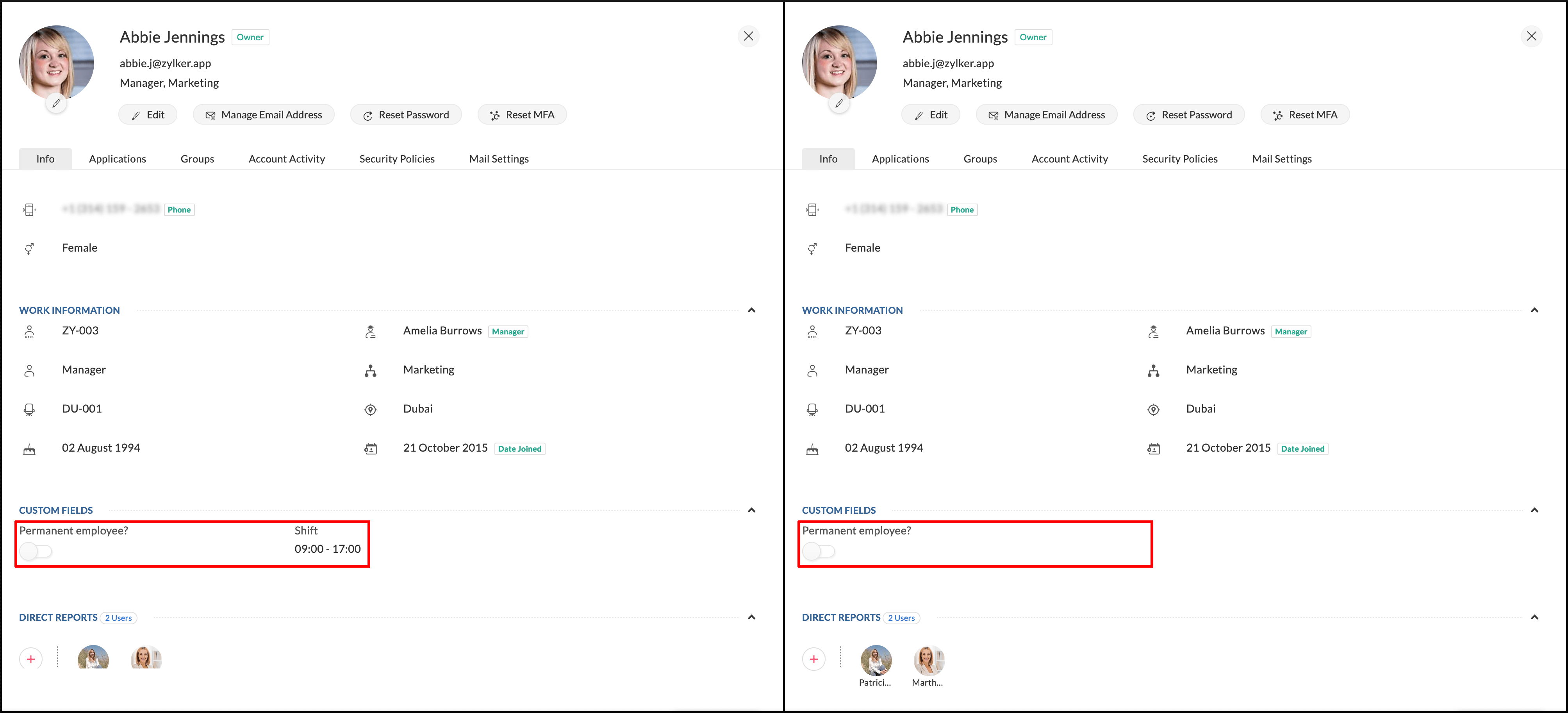 4. Deactivateを選択し、次にOKを選択します。項目は無効とラベル付けされます。無効化した項目の既存ユーザーデータは、その項目が再度有効化されるまでユーザー情報ページには表示されません。
