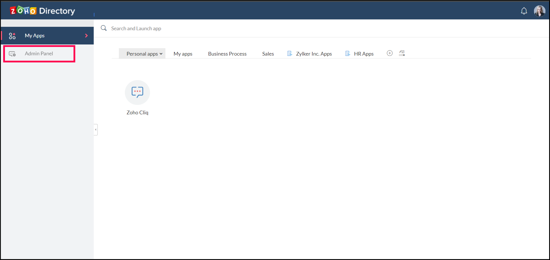 - Zoho Directoryにサインインし、左側のメニューで管理者パネルをクリックします。