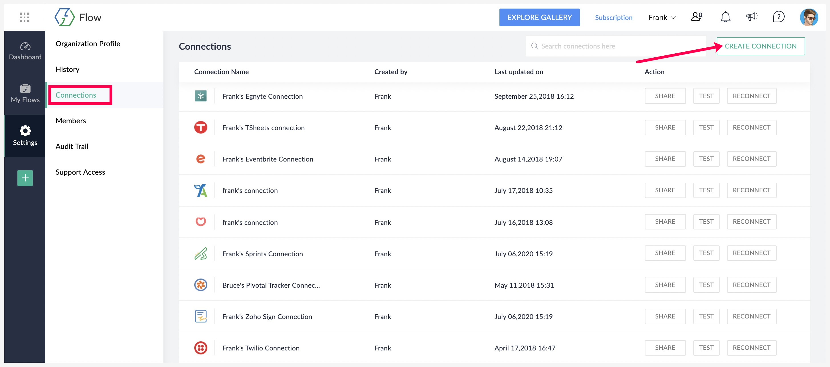 Zoho Flowの組織内で新しい接続が作成されました。既存のログインからサインアウトすることなく、この新しい接続にアクセスすることができます。アカウントの管理者であれば、この新しく作成された接続にアクセスできます。ただし、組織内のすべてのメンバーが利用できるようにするには、接続を共有する必要があります。詳細はこちら