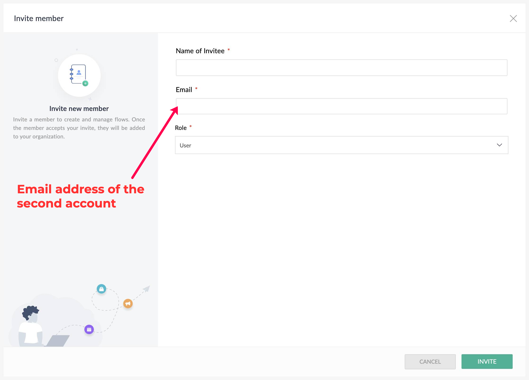 4. メンバーの名前メールアドレス(ZohoアカウントBで使用するメールアドレス)、および役割を入力します。最小の役割(ユーザー)で十分です。