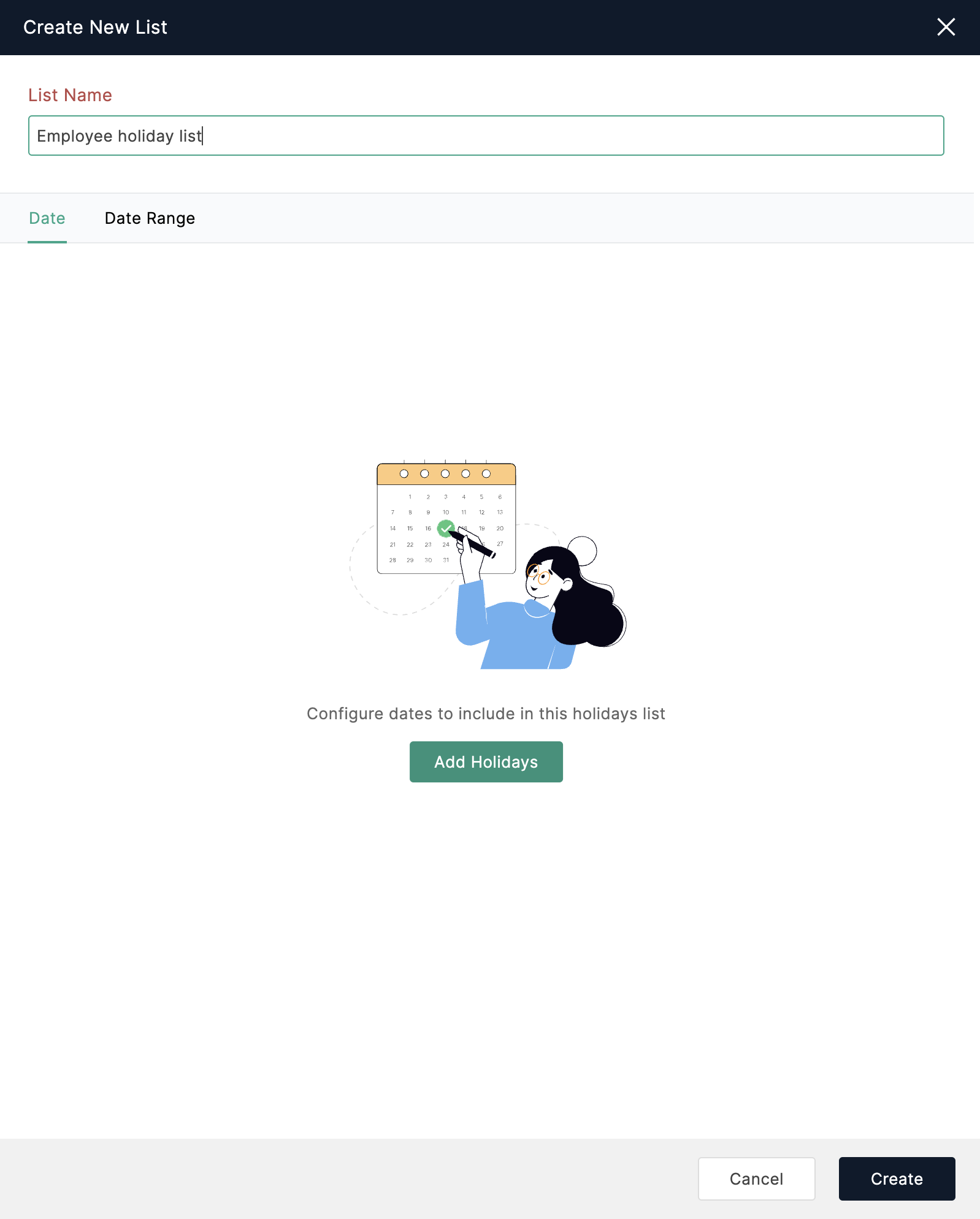 - ポップアップでリスト名を入力し、祝日を追加/ 範囲を追加をクリックします日付および日付範囲タブの下で。