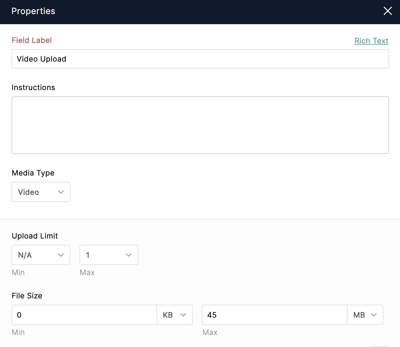 デフォルトでは、ファイルアップロード、または オーディオ/ビデオアップロードフィールドを使用して、最大20 MBのファイルをアップロードできます。