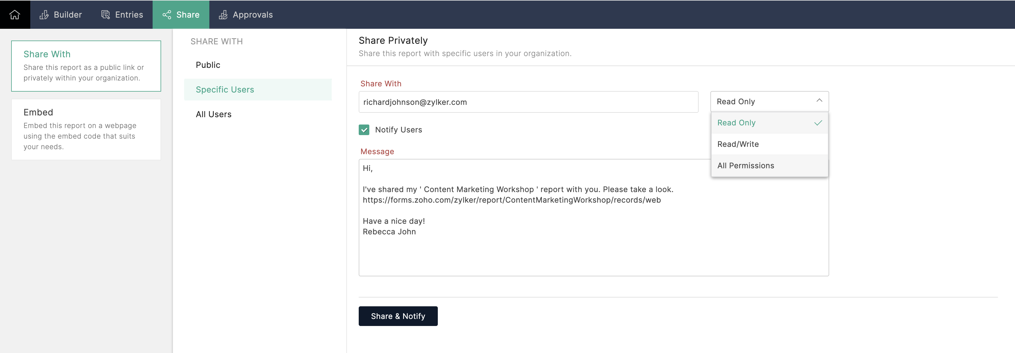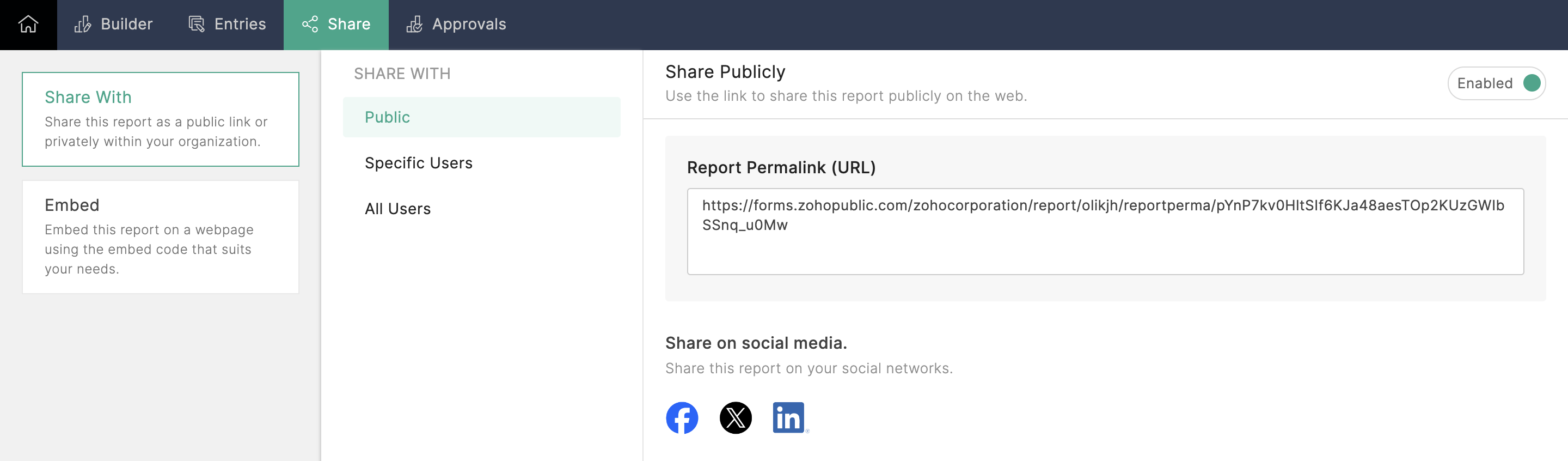 公開共有とは異なり、組織内の特定グループ内でのみデータを共有し、プライバシーを保護できます。レポートをプライベートで共有した場合、Zoho Forms組織のメンバーだけが、各自のZoho Formsアカウントにログインしているときにレポートを閲覧できます。