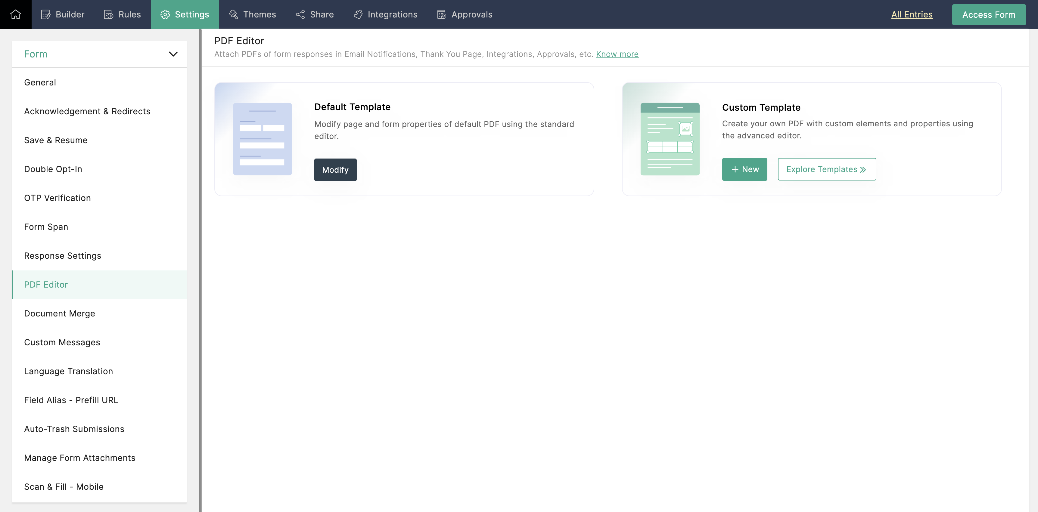 - フォームに対して、最大5つのPDFテンプレートを作成できます。