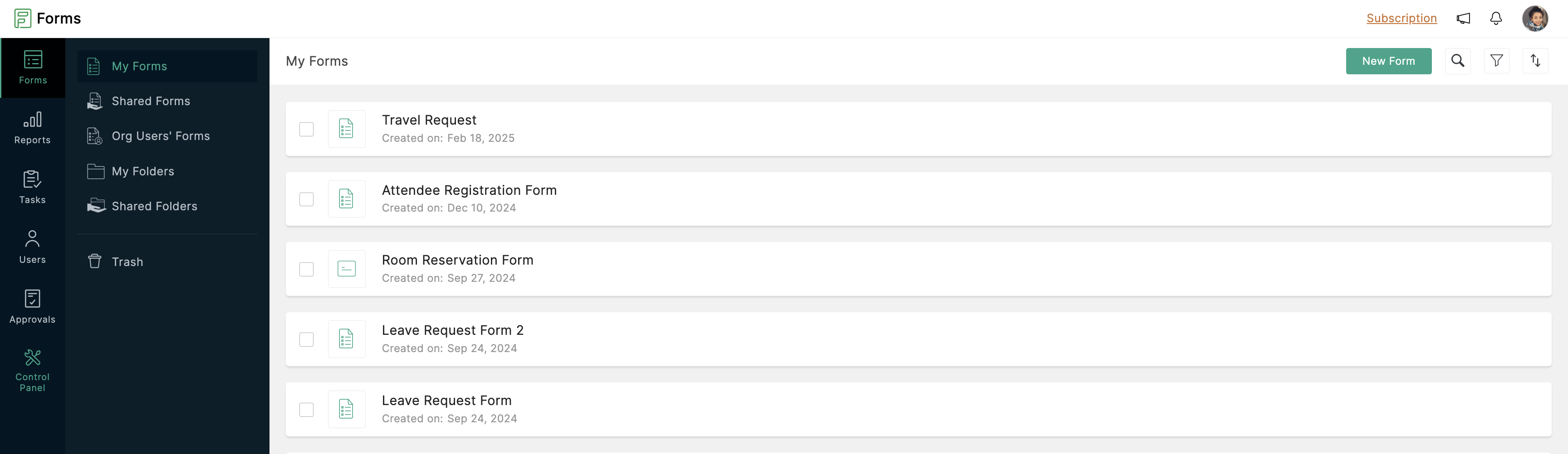 1. フォームビルダ内で、フォーム一覧ページの左側にあるアイコンを選択して、コントロールパネルにアクセスします。