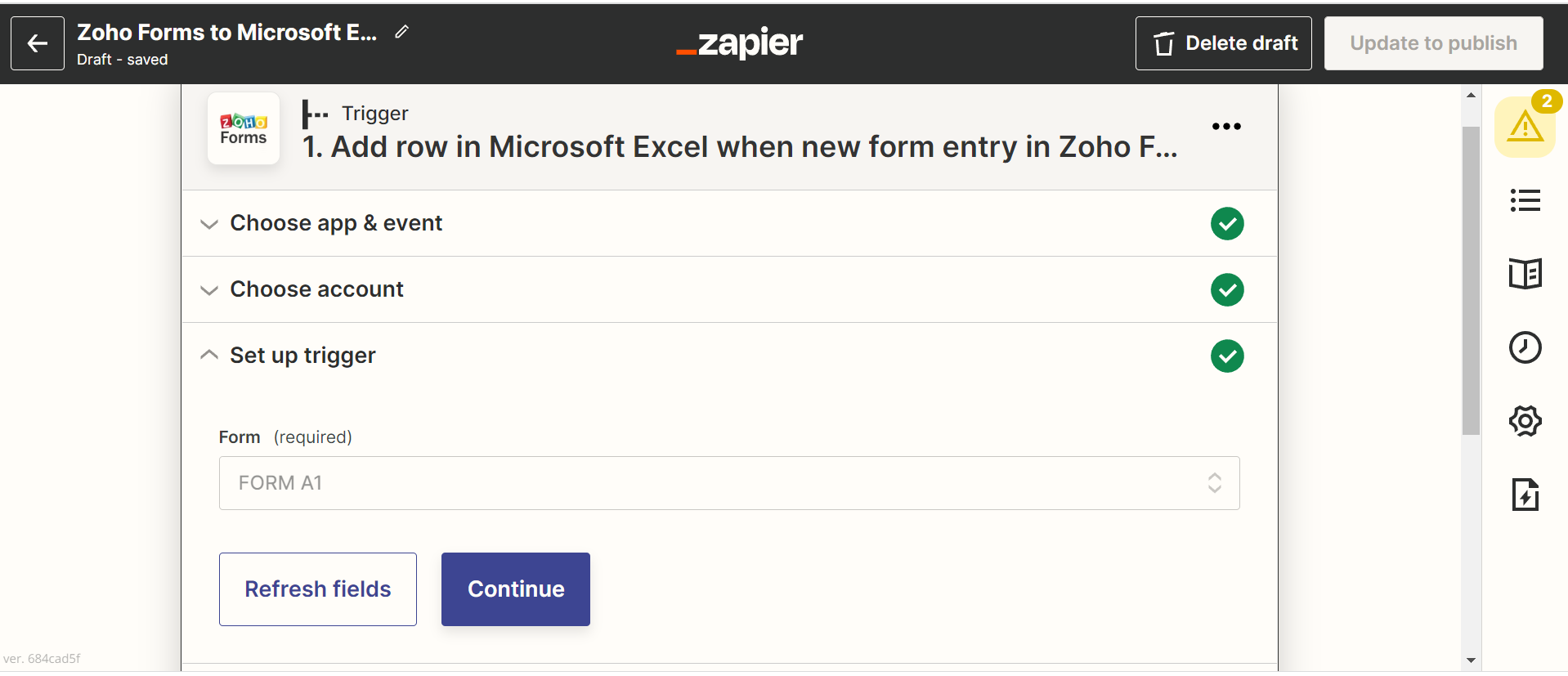 「Microsoft Excel」と統合したいフォームをセットアップトリガーのドロップダウンから選択し、続行をクリックしてください。テストトリガーオプションを使用して、関連するフォームでテストフォームエントリを作成することで、統合をテストすることができます。