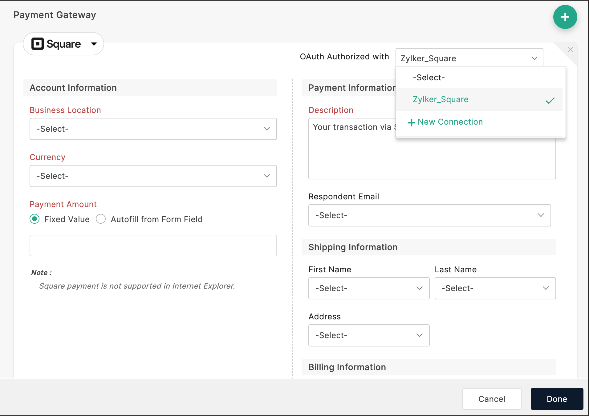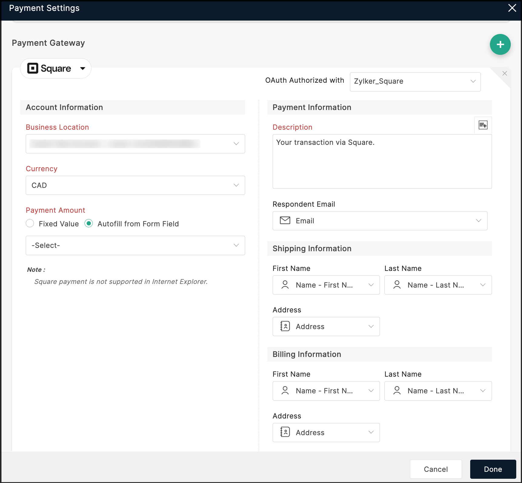 Squareを支払いゲートウェイとして選択した場合、Zoho FormsアカウントをOAuth認証を用いたトークンベースの方式でSquareアカウントにアクセスするために承認する必要があります。