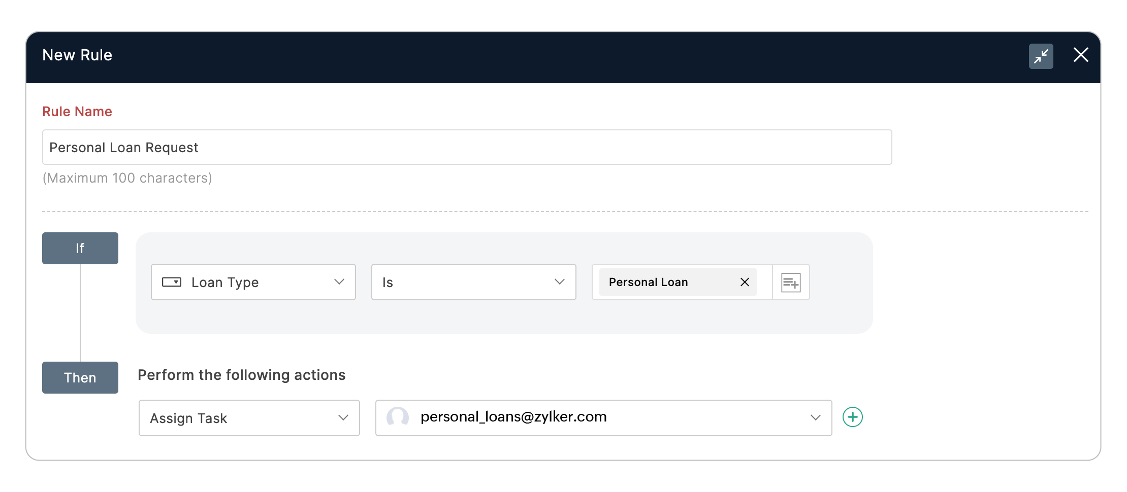 最初のルールを追加します。Loan種類がPersonal Loanの場合、Personal Loan Teamにタスクを割り当てます。