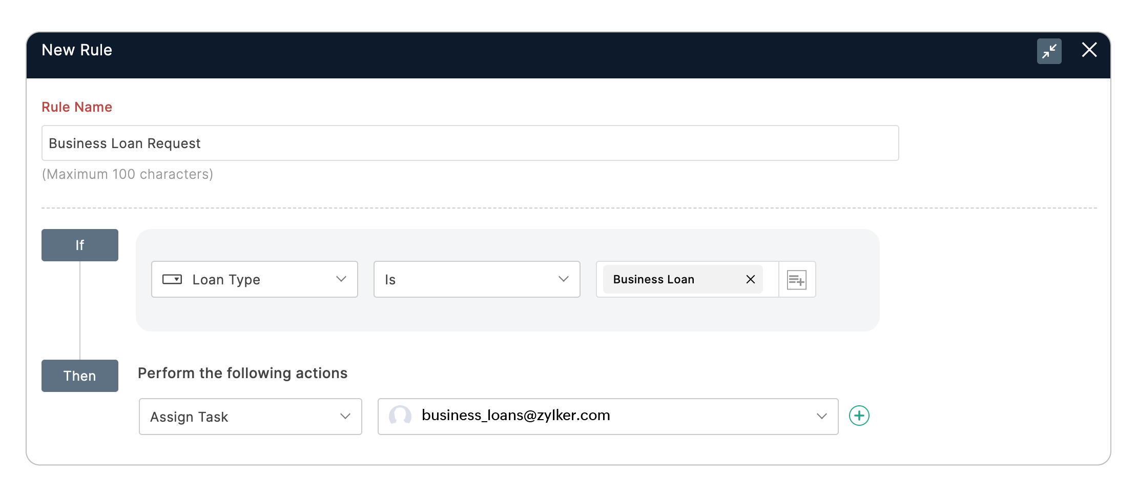 このプロセスを効率化するため、Form RulesをZoho Formsで活用し、顧客が選択したローン種類に基づいて申請を自動的に適切なチームへ割り当てることが可能です。これにより、迅速な対応と手動作業の削減が実現します。
