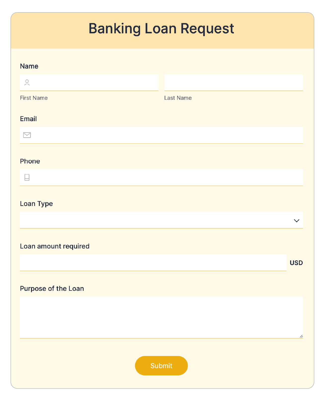 最初の手順は、銀行ローン申請に必要なすべての詳細を取得するフォームを作成することです。これには、名前や連絡先詳細などの個人情報に加え、ローン金額、用途、ローン種類などローン関連情報も含まれます。