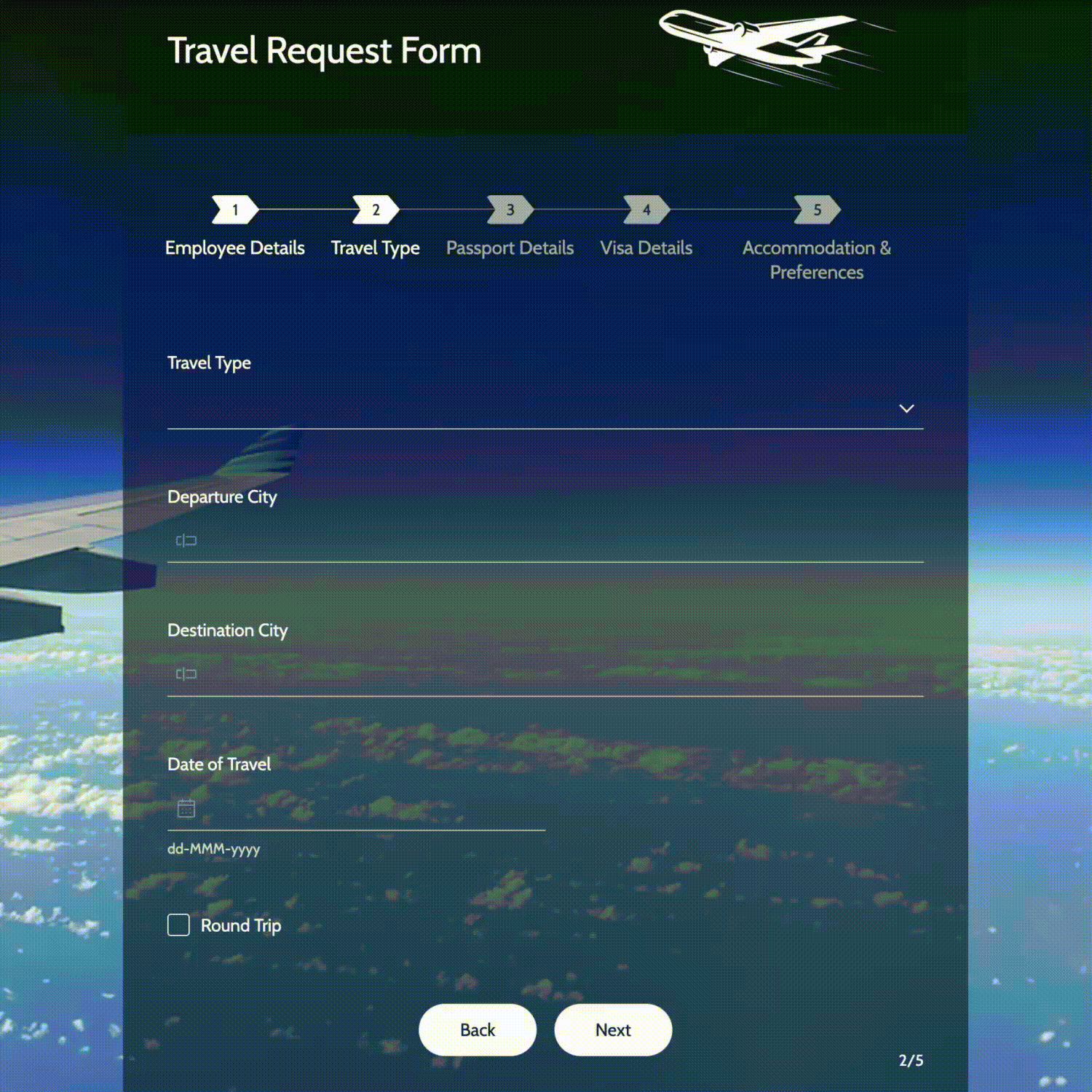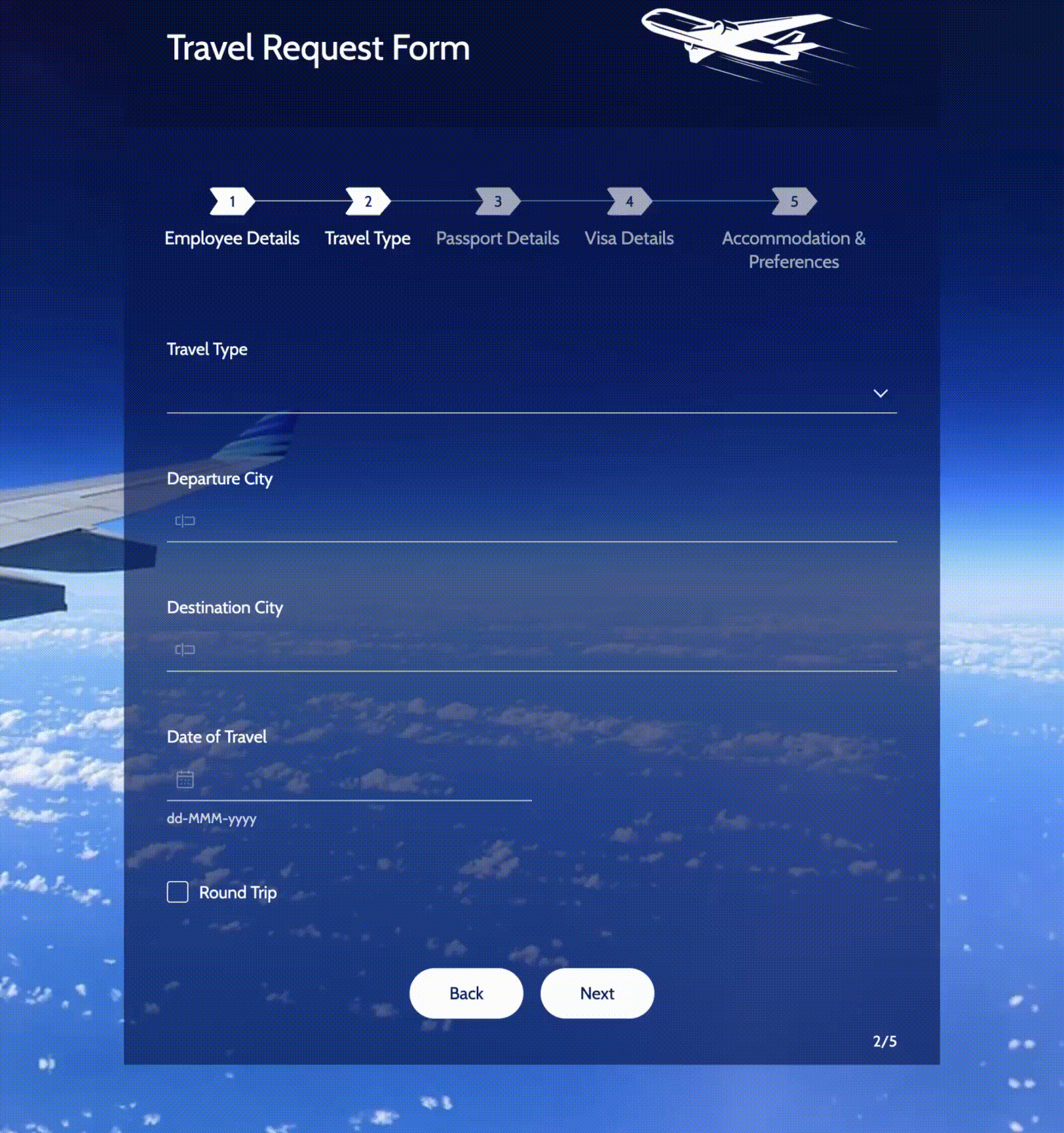 これにより、出張 種類が海外の場合には、フォームがパスポート 詳細(Page 3)に進み、海外出張の自然な流れが継続されます。