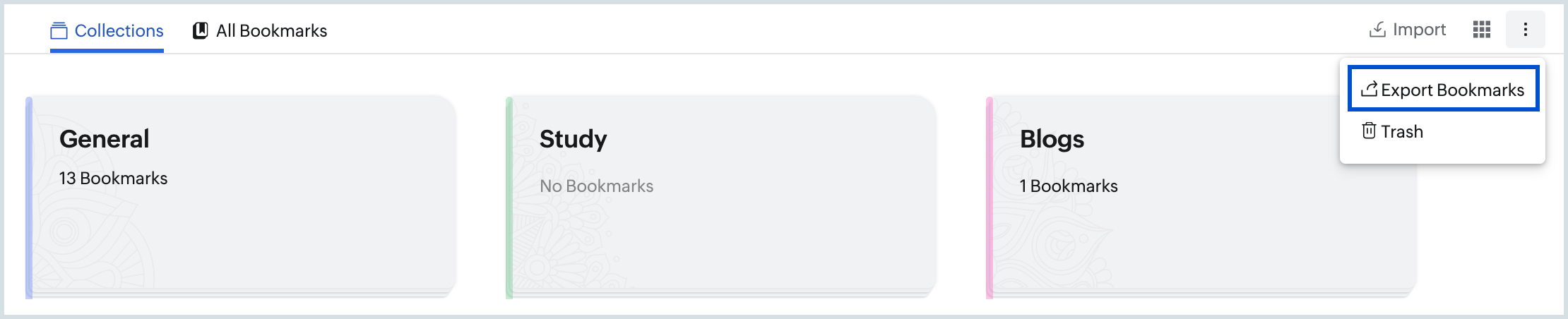 特定のブックマークを選択して、エクスポートできます。ブックマークをエクスポートするには、グループやコレクションに移動して、ブックマークを選択します。上部の[エクスポート]リンクをクリックします。エクスポートが予約設定され、エクスポートされたリンクをダウンロードするためのリンクが記載されたメールが自分のメール宛てに送信されます。ブックマークは、他のデバイスにダウンロードして表示したり、共有したりできます。