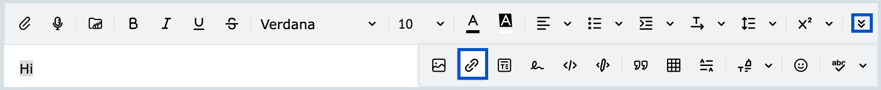 ハイパーリンク/URLを挿入するには、関連付けるテキストを選択し、「Cmnd+K」 または「Ctrl+K」 を押すか、 メールの作成画面でエディターツールから[リンクの挿入]をクリックします。[リンクの挿入] が表示されない場合は、ツールバーのドロップダウンアイコンをクリックし、[リンクの挿入]をクリックします。