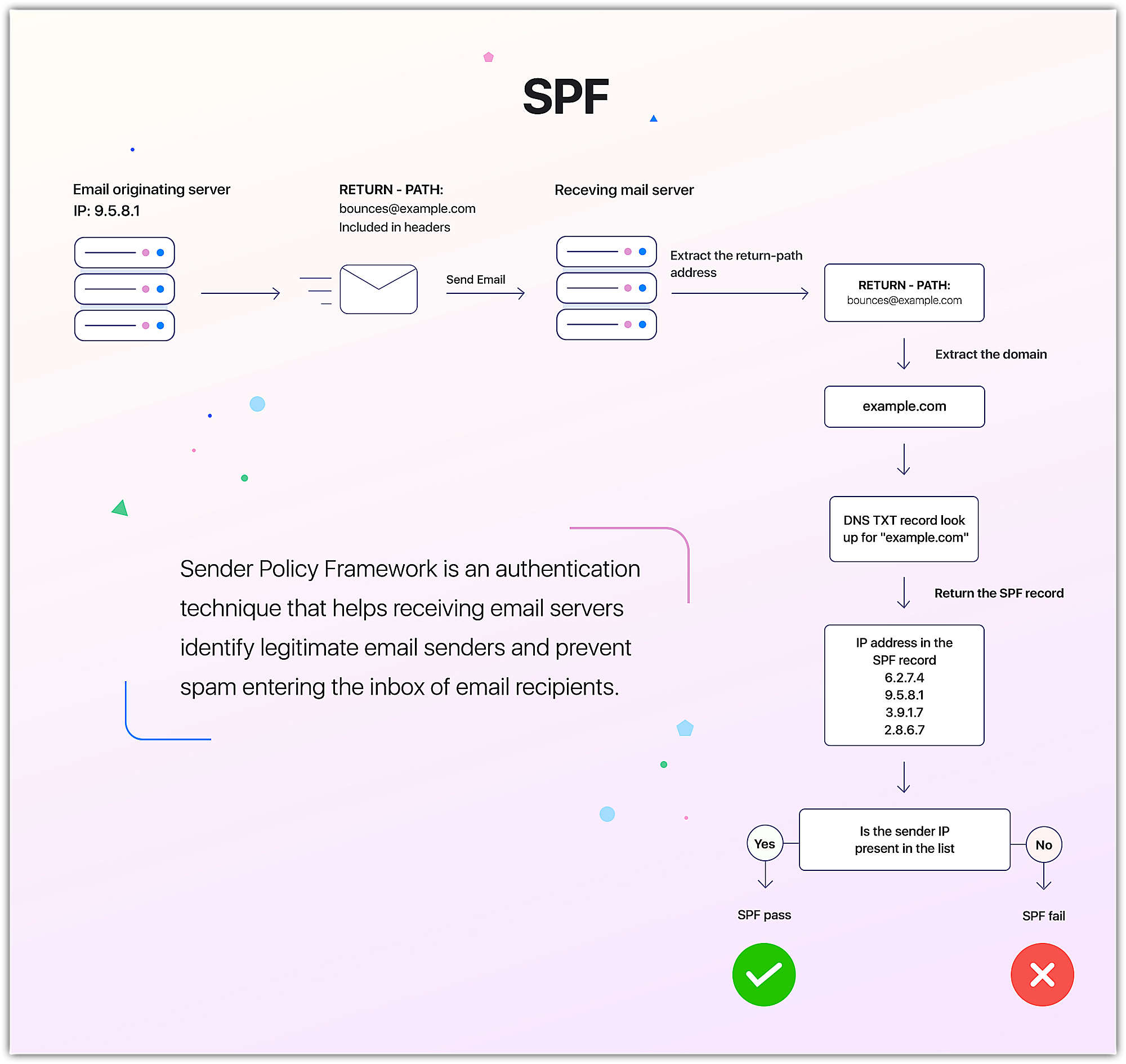 SPFでは、メール送信者が自身の代理でメールが送信されるIPアドレスのリストを公開できます。キャンペーンメールを送信すると、受信側のメールボックスプロバイダーのサーバーが返品する-pathドメインのTXTデータDNS検索を行います。その結果、SPFデータが返されます。SPFデータには、代理でメール送信が認証されているIPアドレスのリストが含まれます。メールキャンペーンの送信に使用されたIP住所がそのリストに含まれていれば、そのメールはSPF認証をパスします。