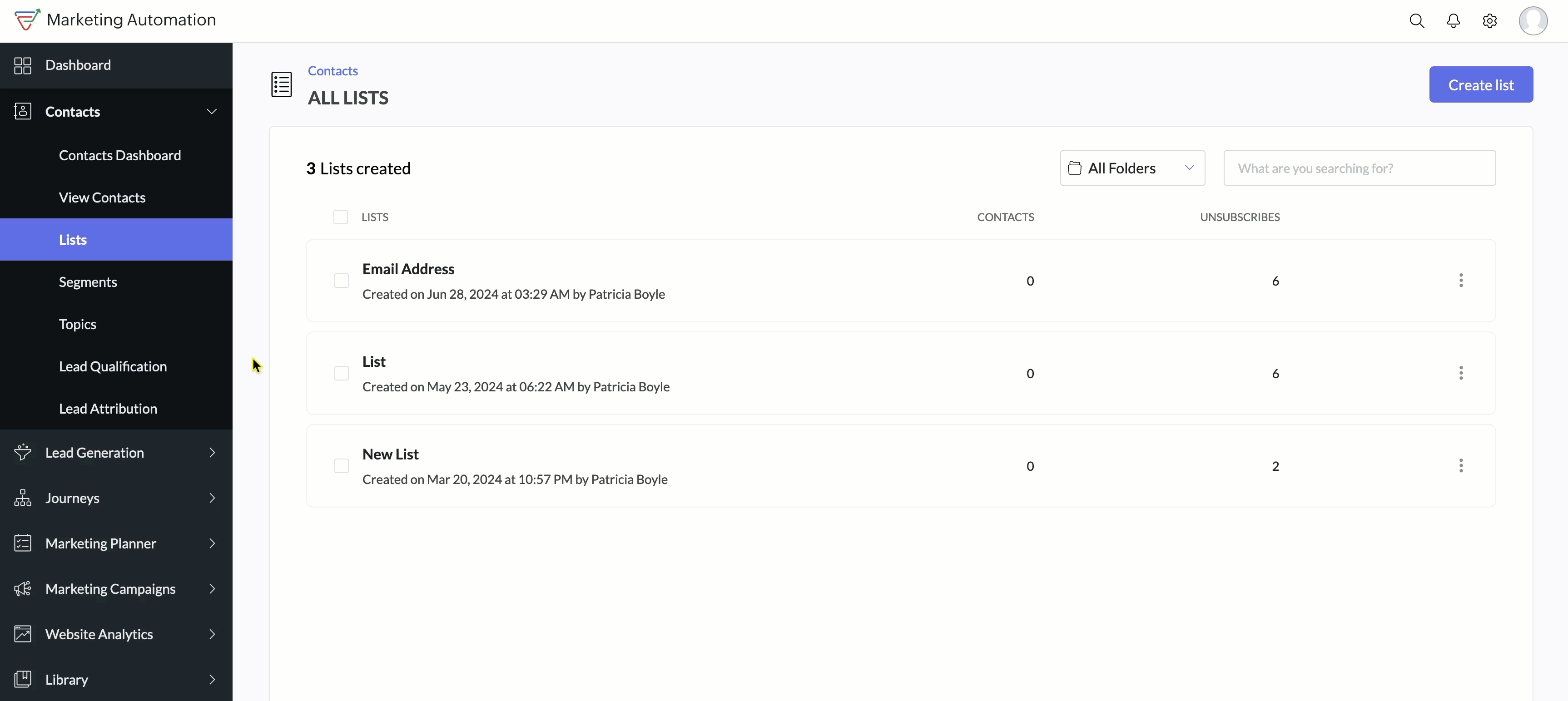 Zoho Marketing 自動化では、リストをさまざまなフォルダーに整理できます。同様に、セグメント、リードジェネレーションレポート、サインアップフォーム、サインアップポップアップ、ランディングページも同じ手順で管理可能です。すべてのタブで手順は共通です。リストで新規フォルダーを作成するには、以下の手順に従ってください。