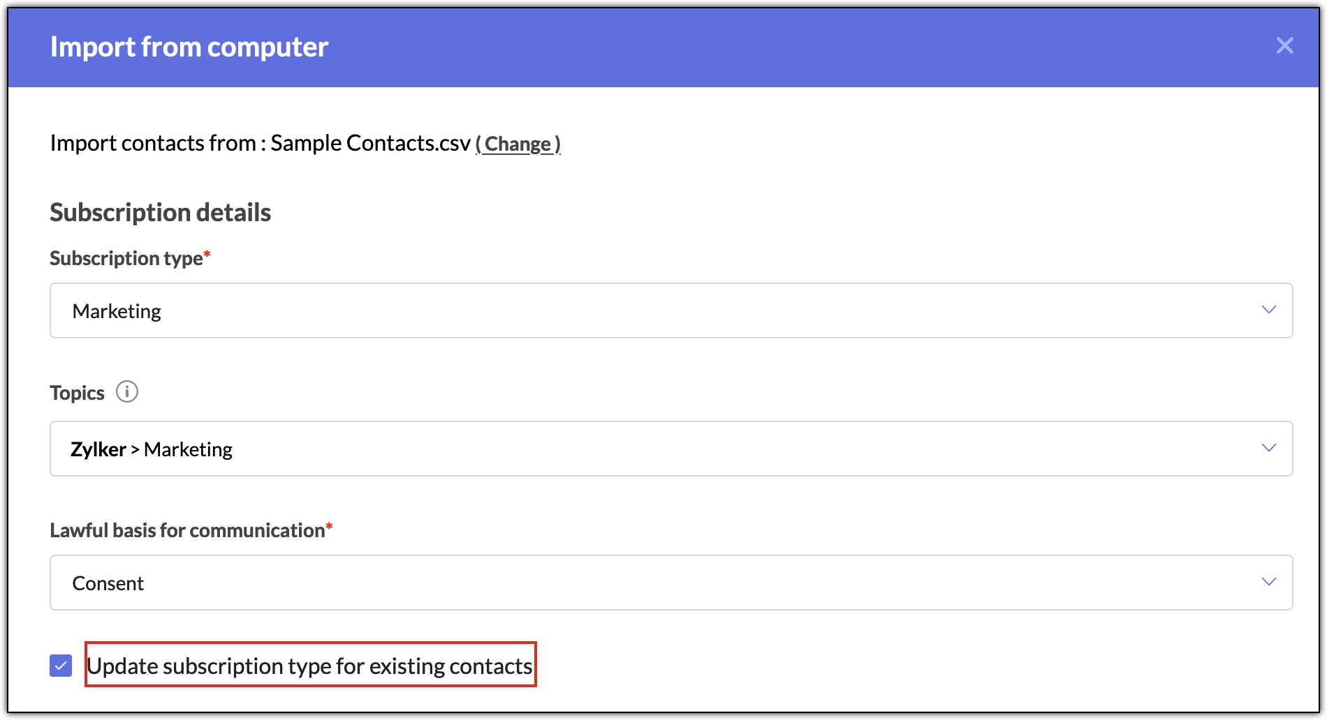 例えば、インポートするファイルに500人の連絡先がいて、そのうちの200人の連絡先が既にZoho Marketing 自動化 アカウントに存在するとします。しかしながら、その200人の連絡先については、サブスクリプション種類を非マーケティングからマーケティングへと変更したいと考えているとしましょう。このような場合、これらの連絡先のサブスクリプション種類を一つ一つ手動で更新するのではなく、インポートする過程で変更することで、手続きをより迅速かつスムーズに行なうことができます。コンピュータからあるいはクラウドサービスからインポートするファイルを選択した後に、既存の連絡先のためのサブスクリプションの更新種類のオプションをチェックすることができることを忘れてはいけません。