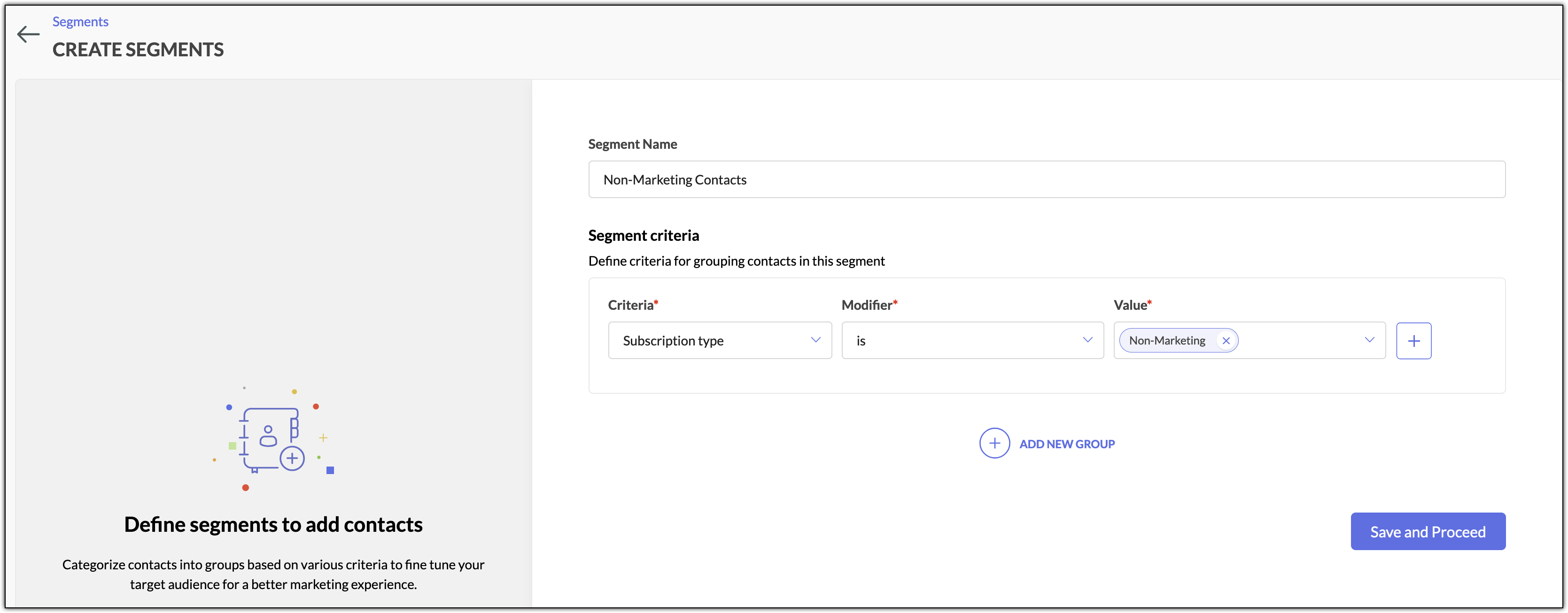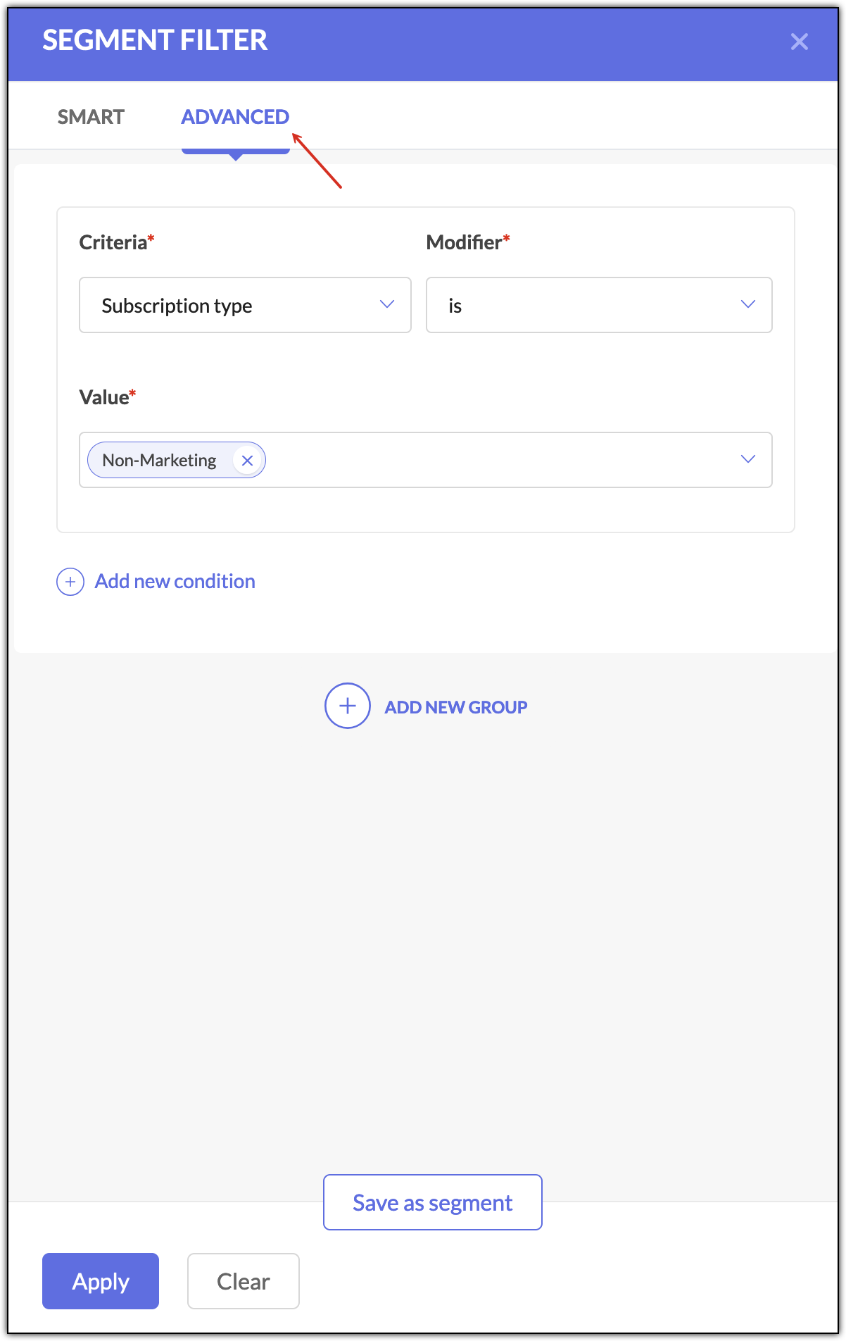 4. Criteriaサブスクリプション種類を選択します。Modifierとして「is」を選び、としてNon-Marketingを選択します。