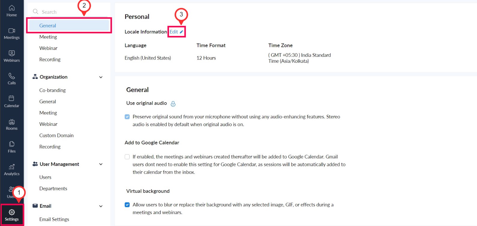 「」アイコンを「Locale Information」の横でクリックし、希望の設定を編集します。