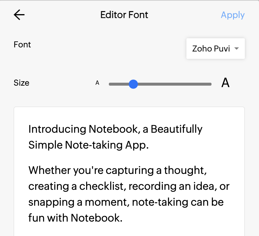 Zoho Notebook は、デバイスが変わっても読みやすさを保ちつつ、統一された記述体験を提供できるよう、柔軟なフォント設定に対応しています。