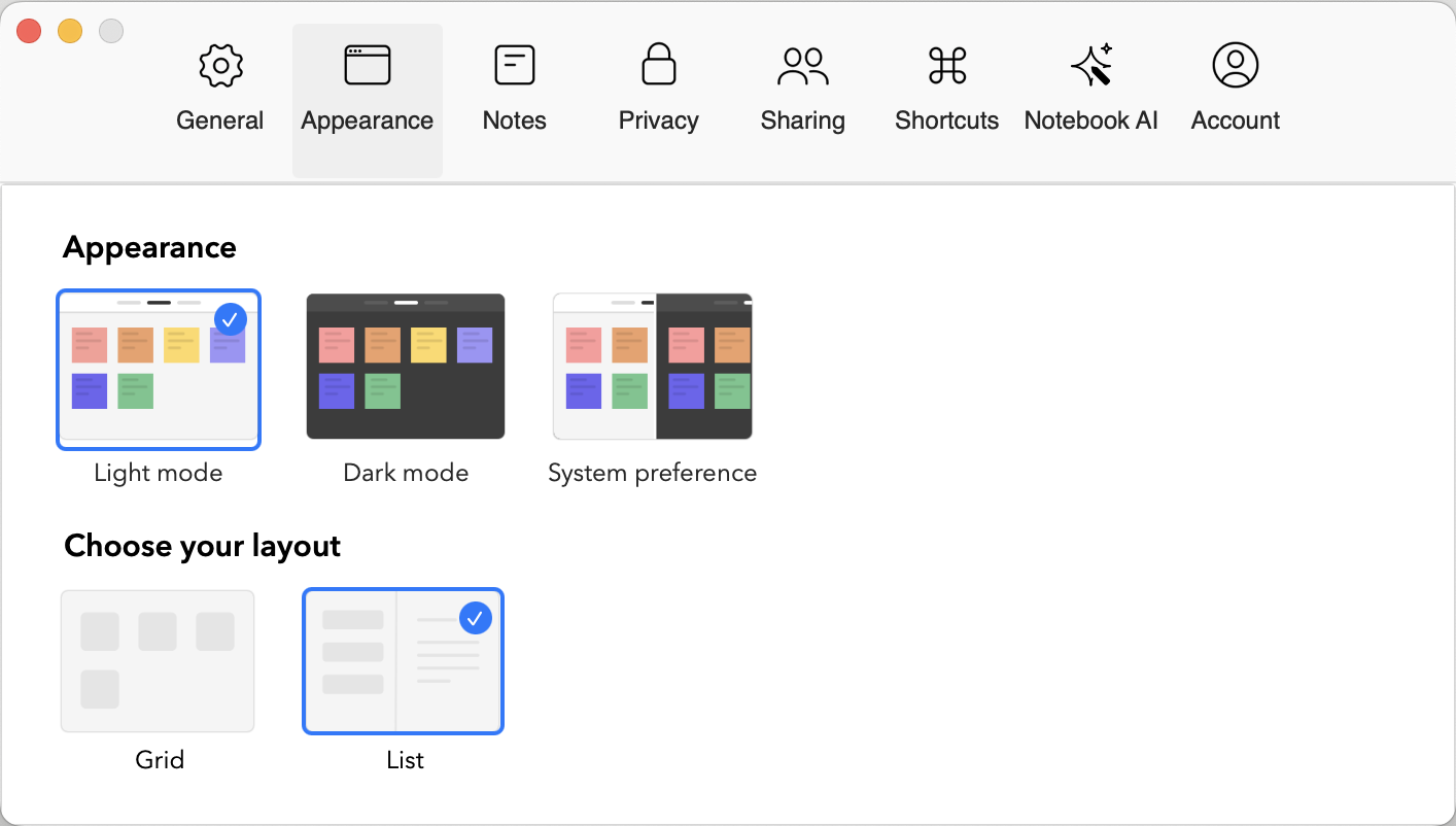 ユーザーは、テーマ、ノートブックの表紙、レイアウト、フォント、メモの見た目、並べ替え設定などをカスタマイズして、直感的で使いやすいワークスペースを作成できます。