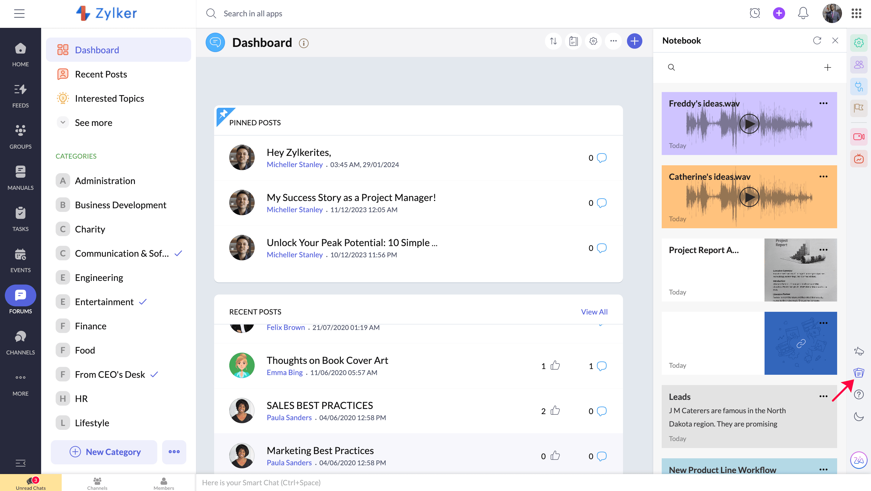 1. Zoho Connect Webアプリの右パネルにあるNotebookアイコンをクリックすると、Notebookで作成したすべてのメモが表示されます。