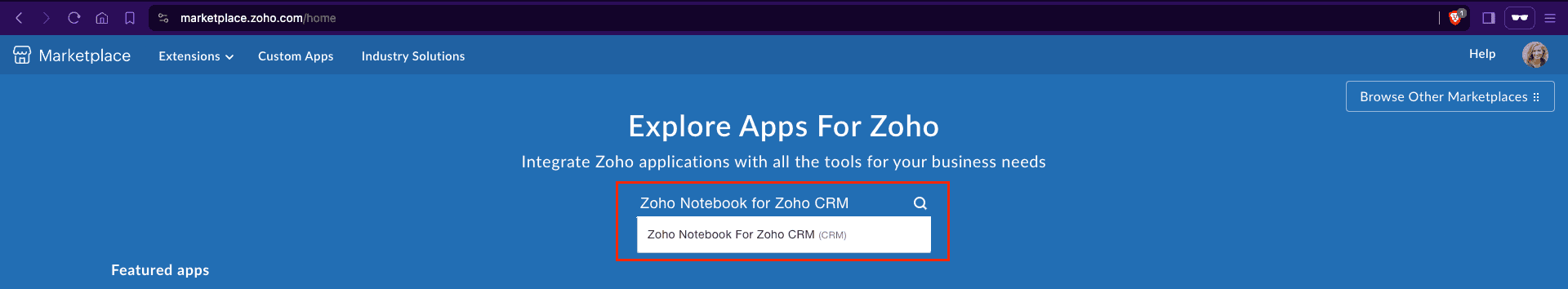 Zoho CRM で、設定> マーケットプレイス> すべてへ移動します。