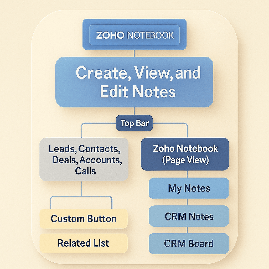 インストール後、Zoho NotebookアイコンをCRMの上部棒グラフに検索・追加することで、シームレスにアクセスできます。下記のフローチャートは、CRM内でNotebookを操作する手順を案内します。