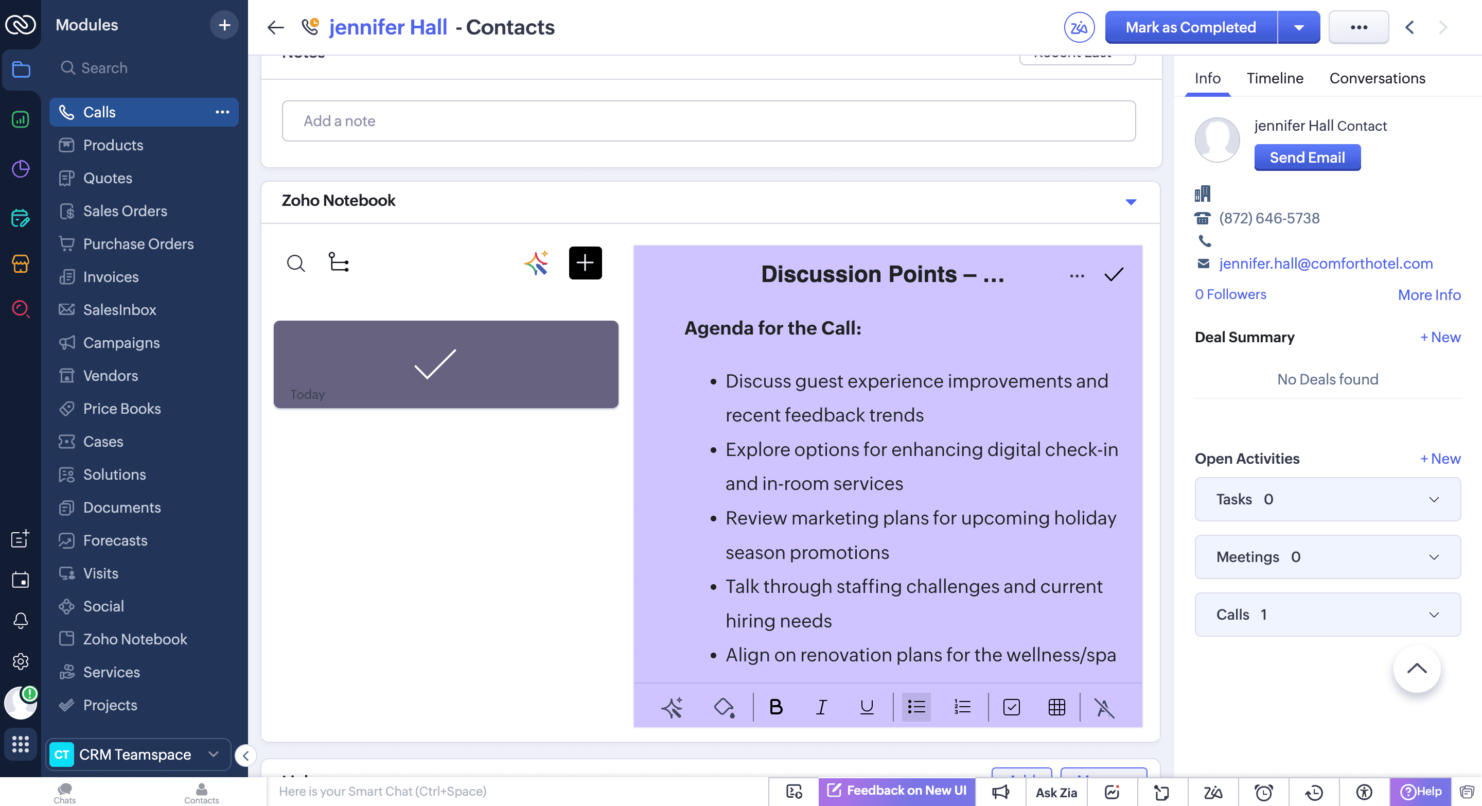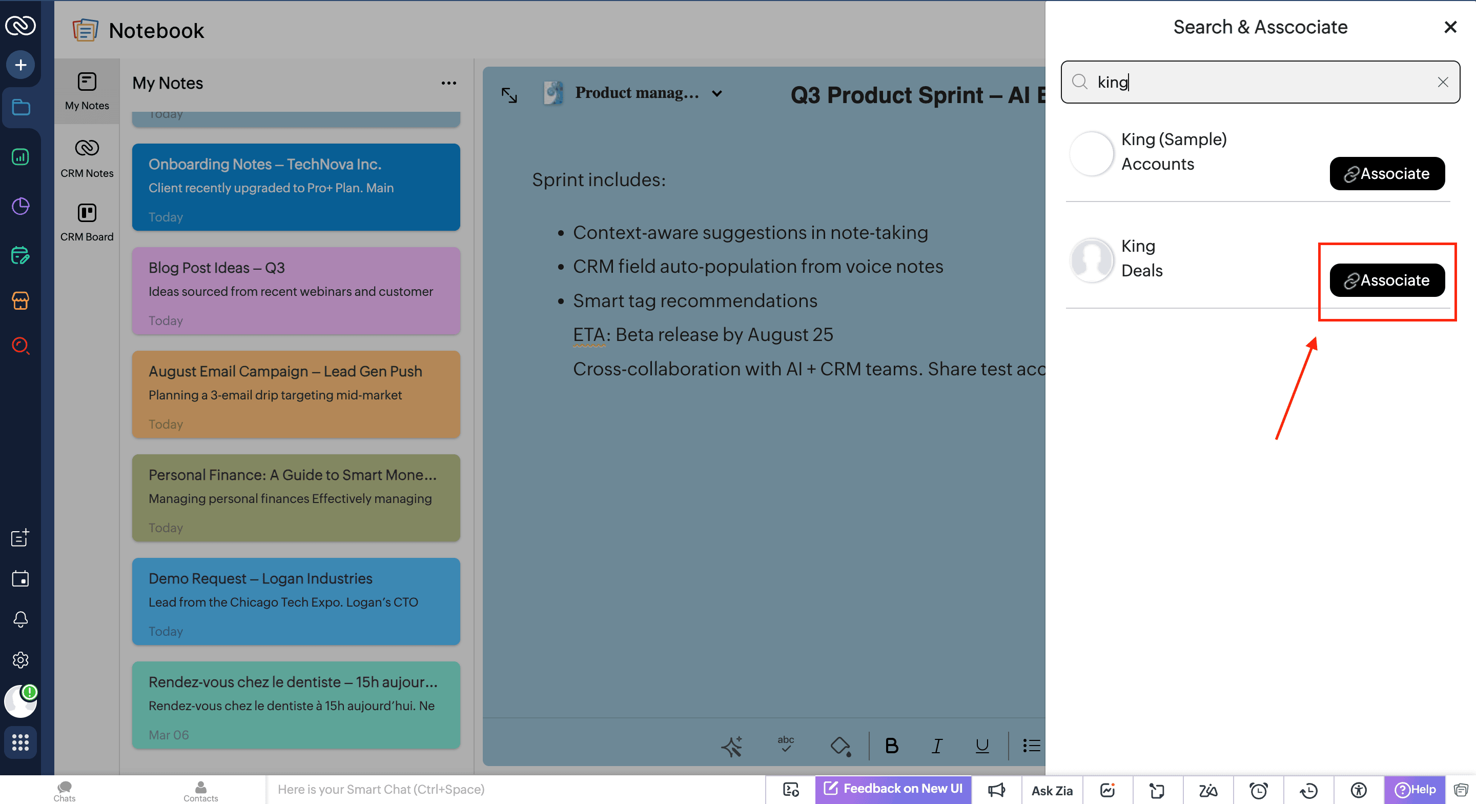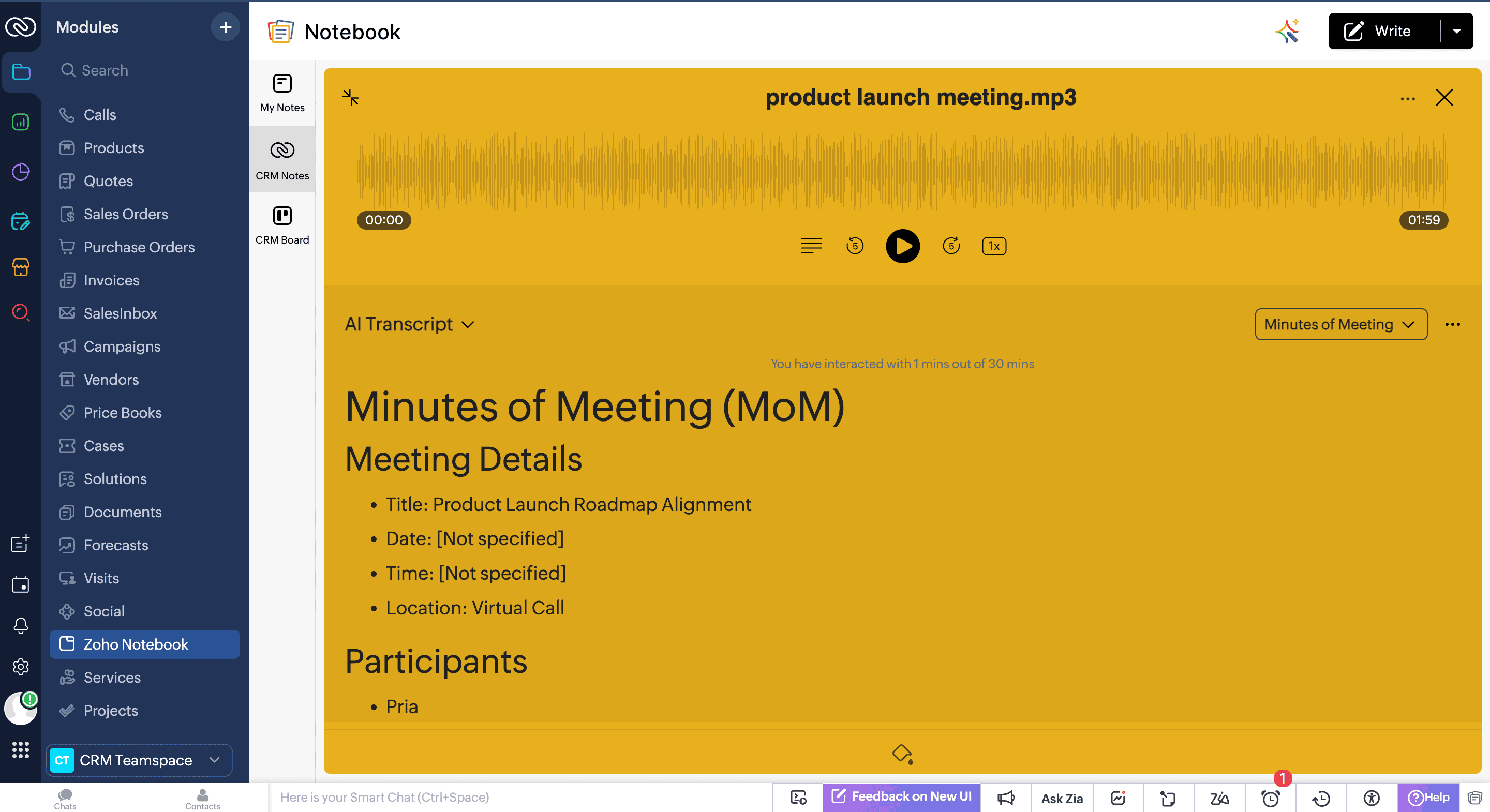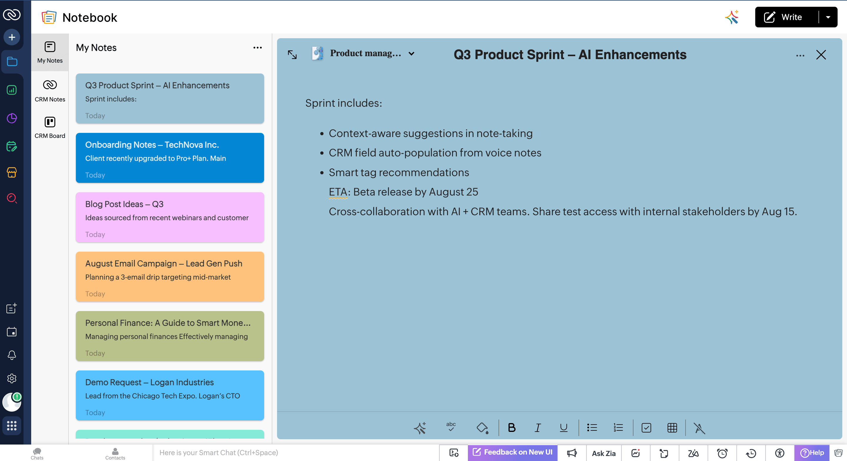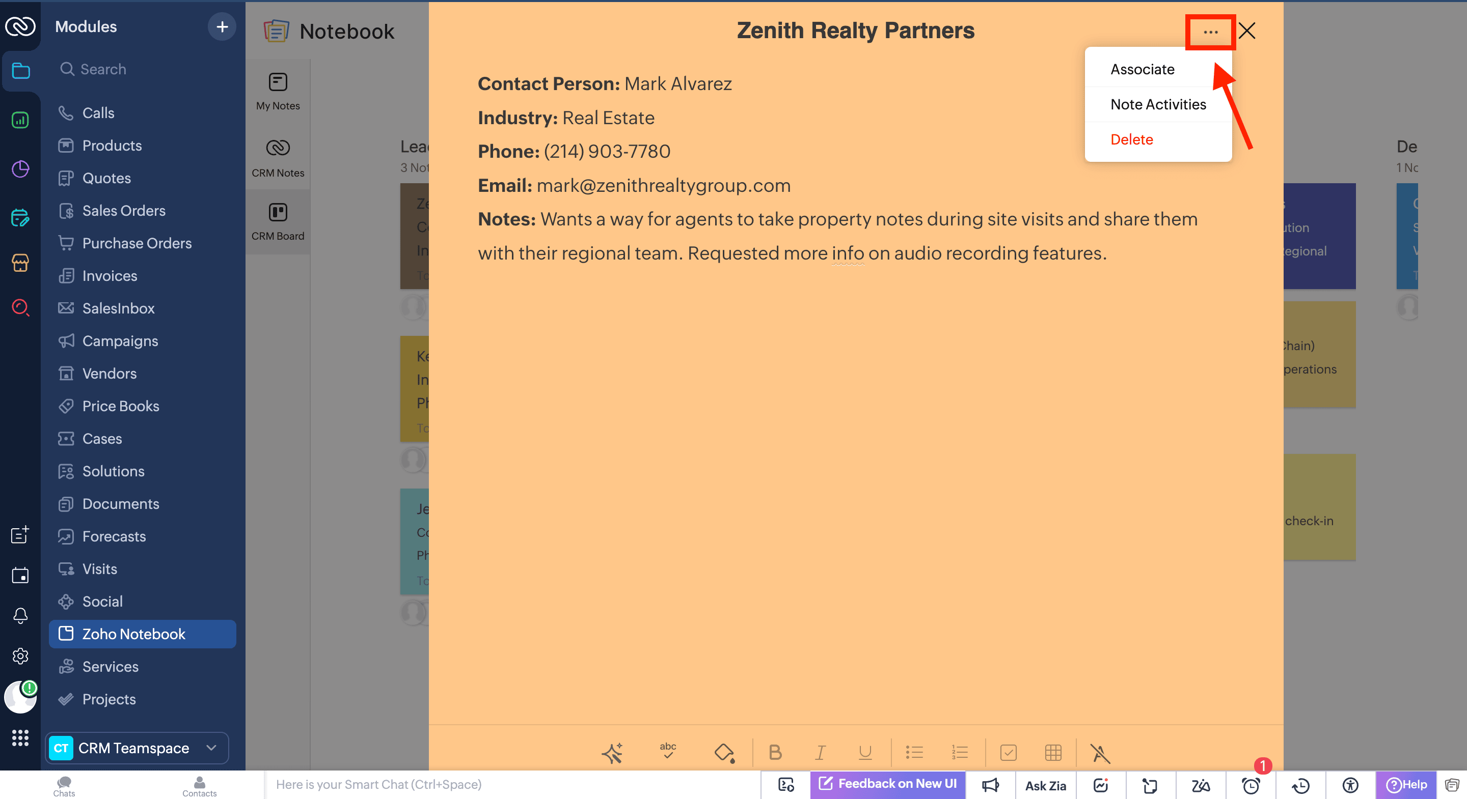 強化されたZoho CRM用Notebook拡張機能は、メモ取りを共同作業かつコンテキスト重視の体験へと進化させます。アイデアのスピーディな記録から、詳細なクライアント通話の書き起こしまで、必要なツールがCRM内に統合されています。