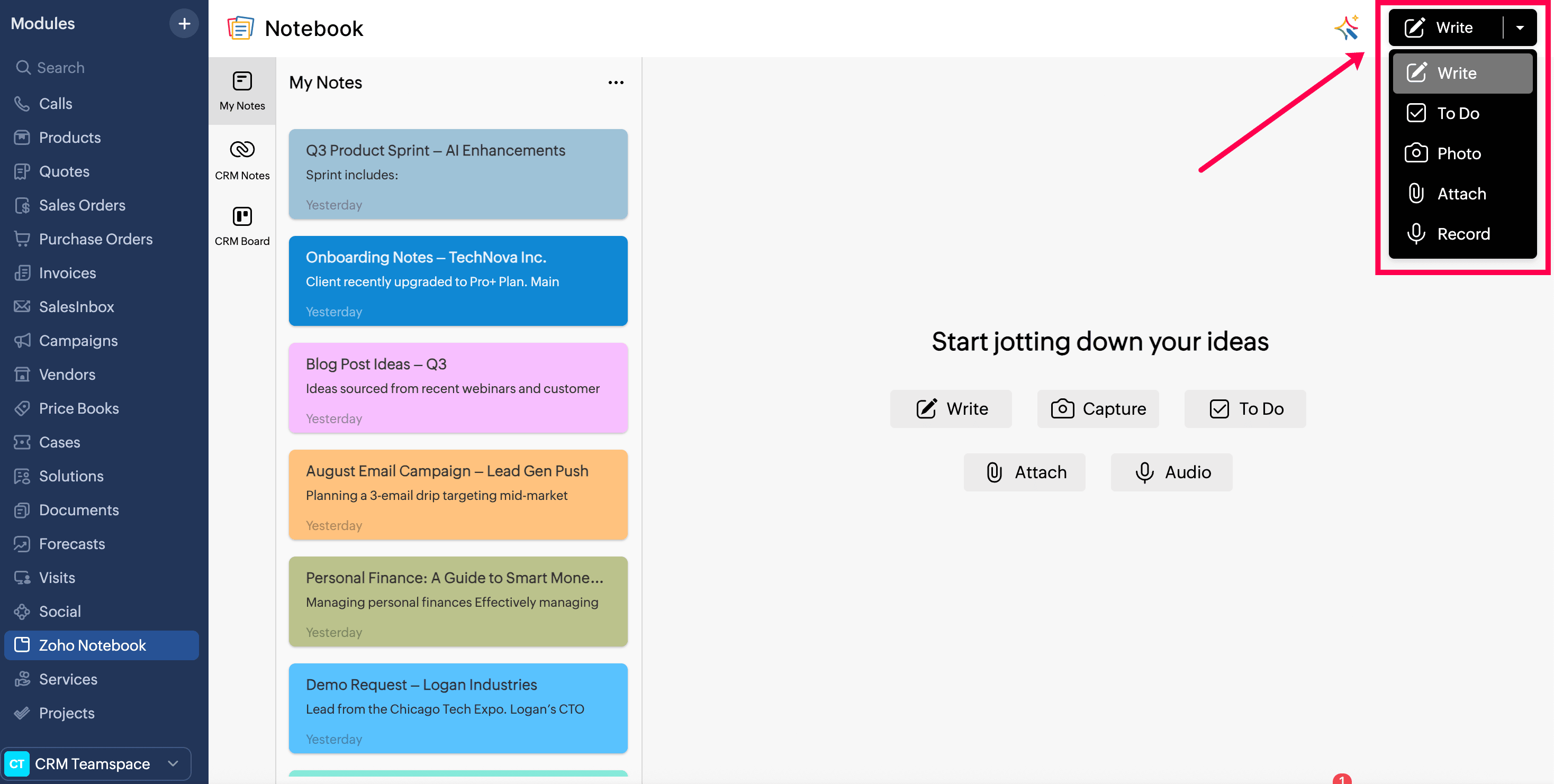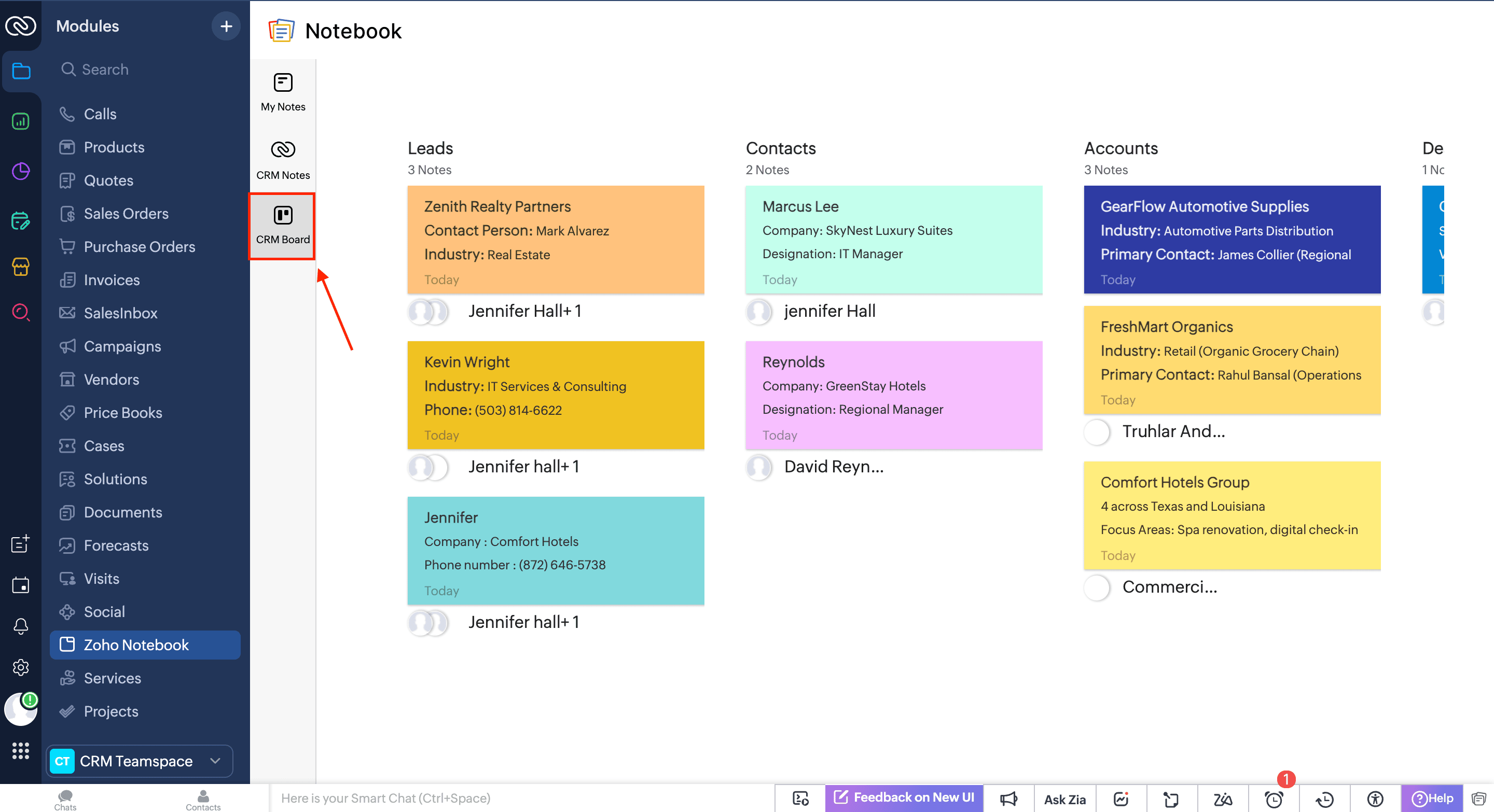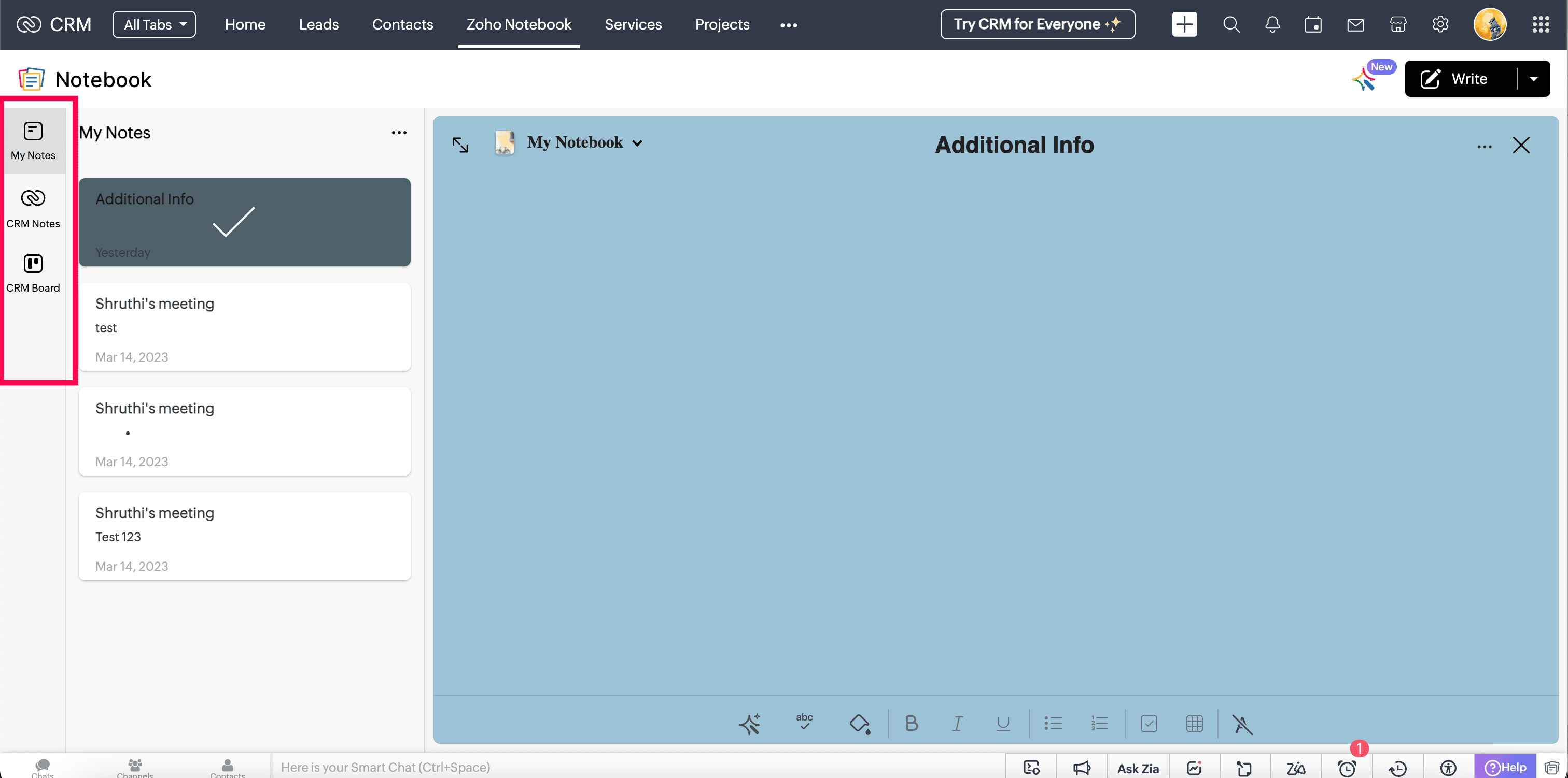 My メモ、CRM メモ、およびCRM Boardは、上部バーのZoho Notebookオプション内に専用のページ表示があります。