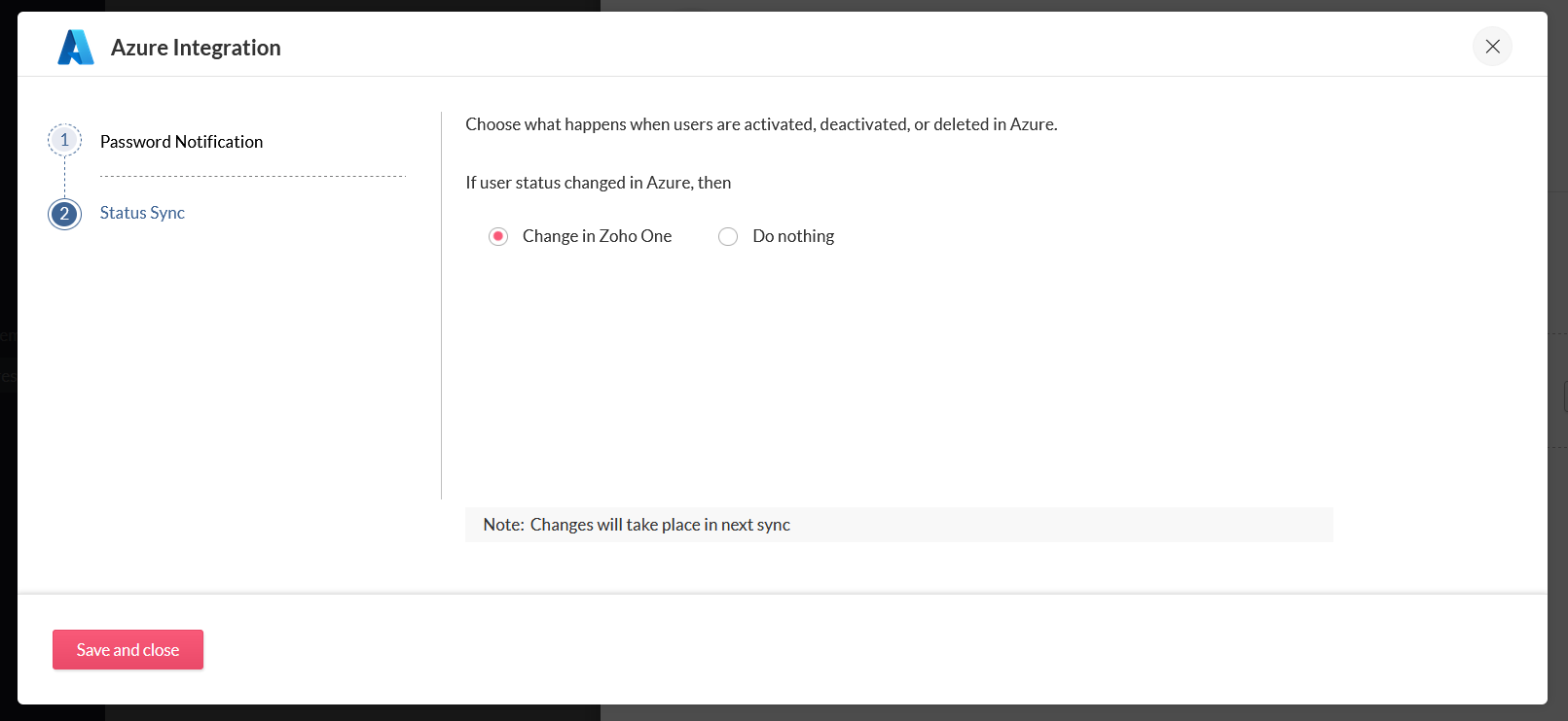 11. Microsoft AzureからZoho Oneへの、ユーザーのステータスの同期方法を選択します。