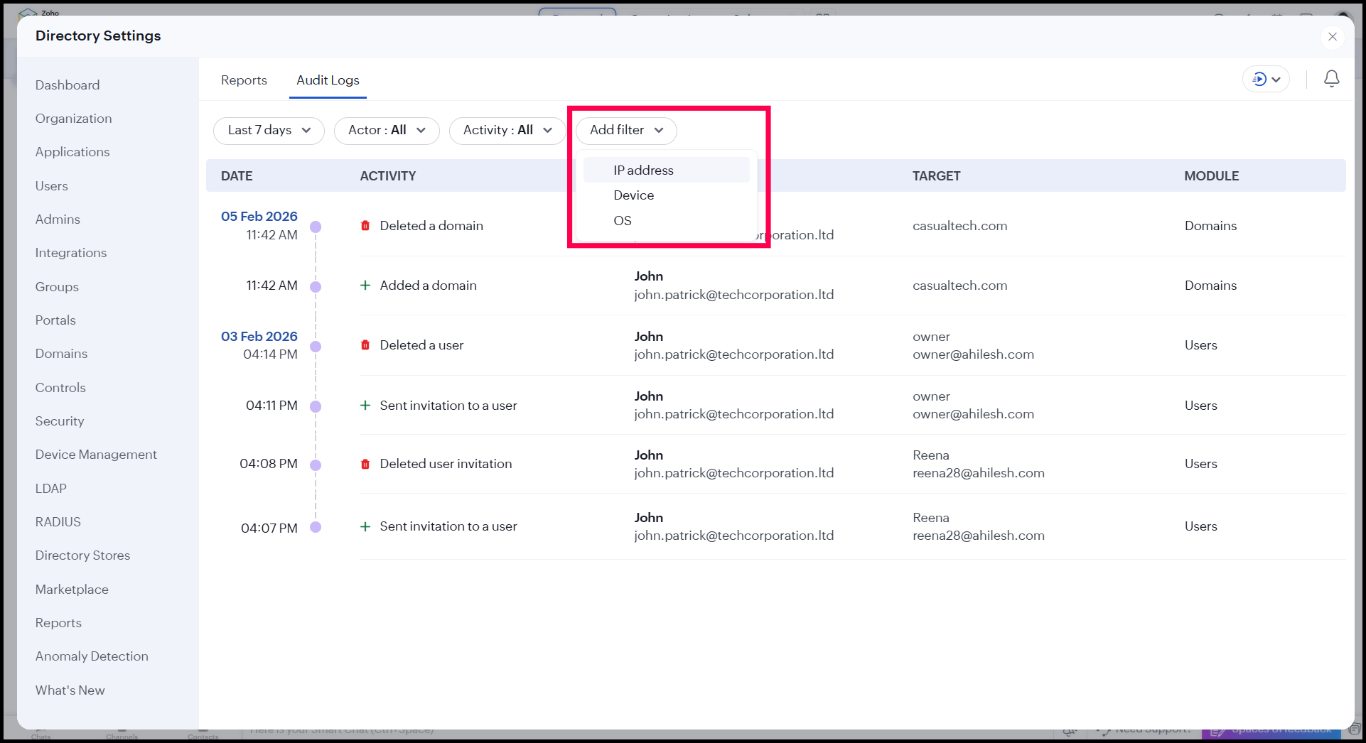 ターゲットでフィルターするには: アクティビティ ドロップダウンからアクティビティを選択します。Target フィルターが自動的に表示されます。 IP アドレス、デバイス、OS でフィルターするには: フィルターを追加 をクリックし、目的のオプションを選択します。 すべてのフィルターをリセットするには: フィルターをリセット をクリックします。