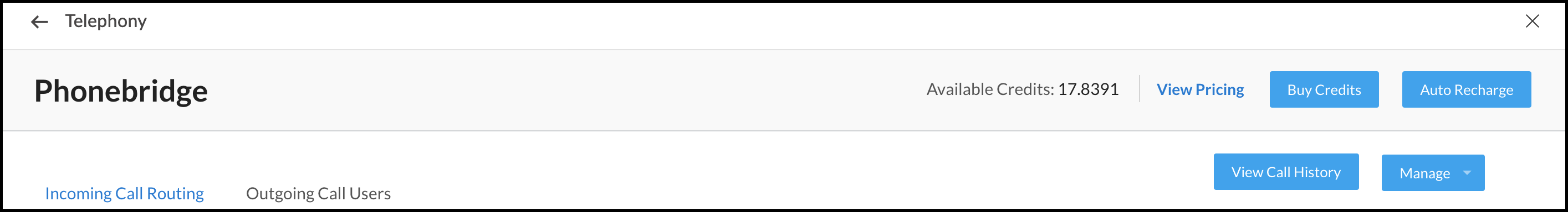 Zoho Oneから通話を発信したり、受信したりするには、クレジットが必要です。クレジットは、ポイントのようなものです。組織の所在地や電話番号の種類に応じて、発着信が行われるたびにクレジットが引き落とされます。クレジットの残高 は、画面上部で確認することが可能です。