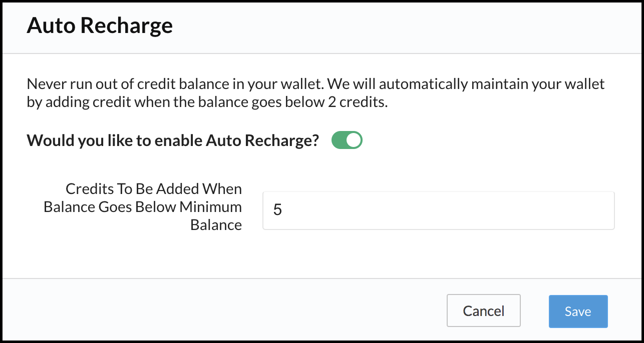 クレジットの残高が2を下回った場合、自動チャージにより、指定したクレジット数が自動で購入されます。