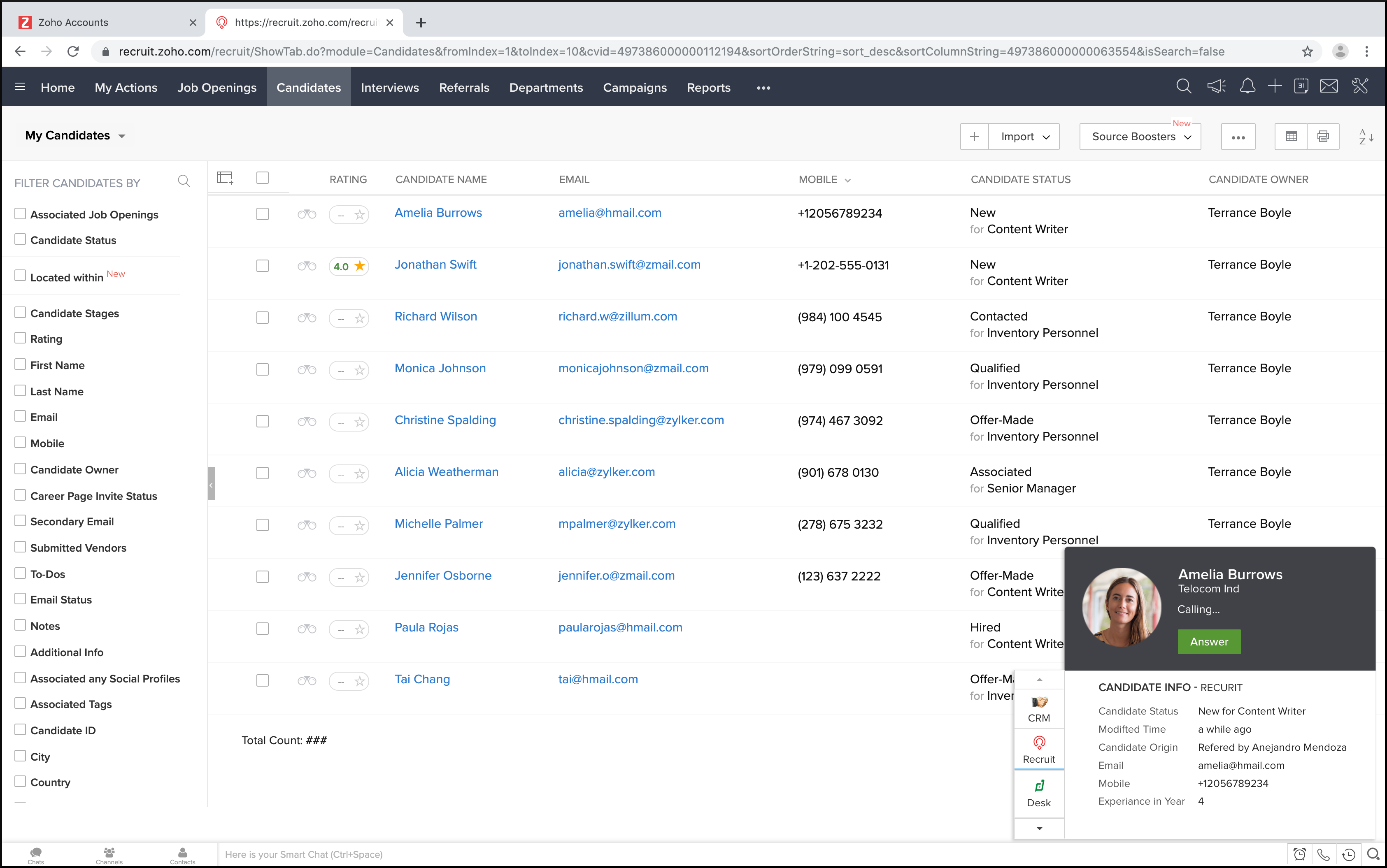 電話連携の機能では、電話機能を提供するサービスと連携し、Zohoアプリケーションから通話を開始することができます。
